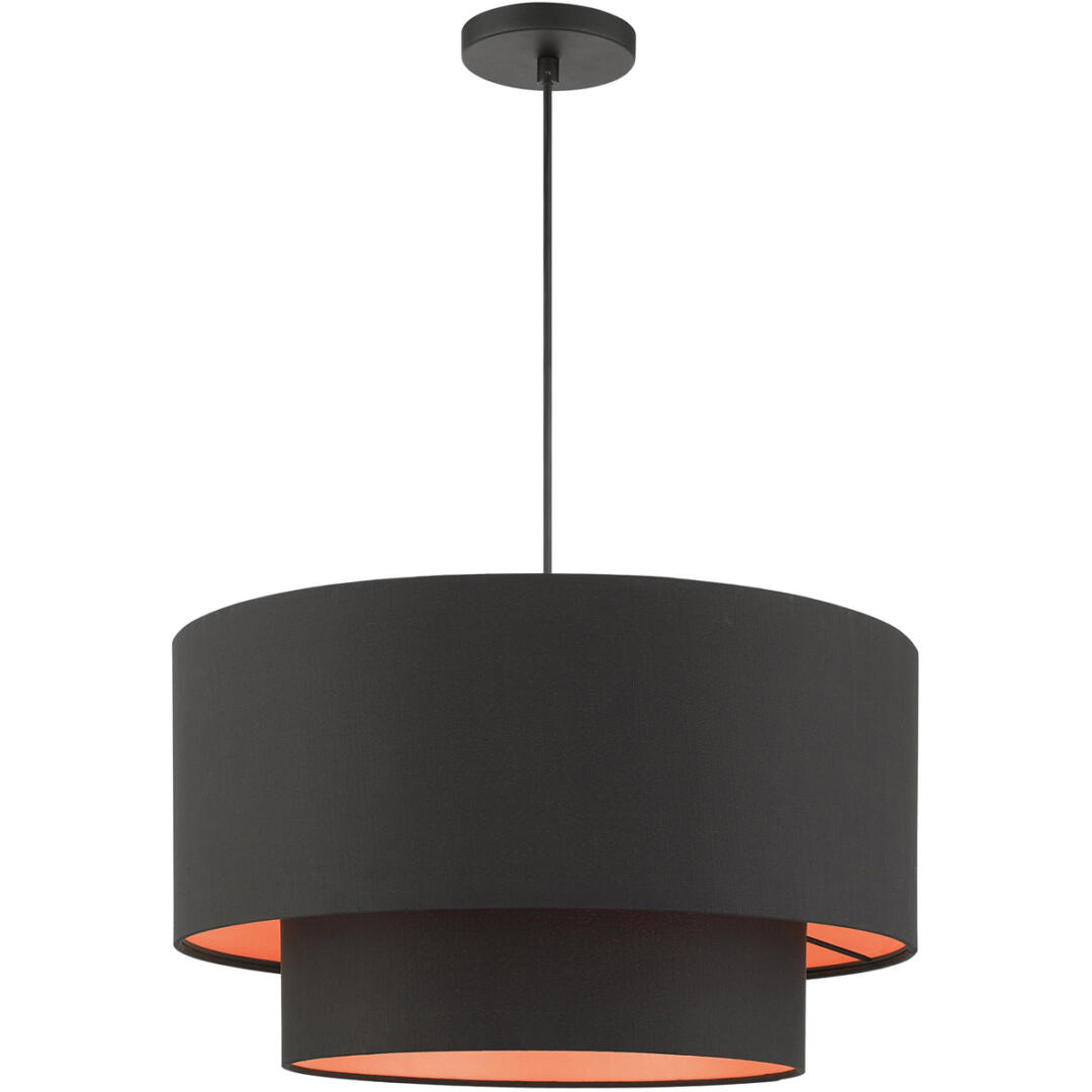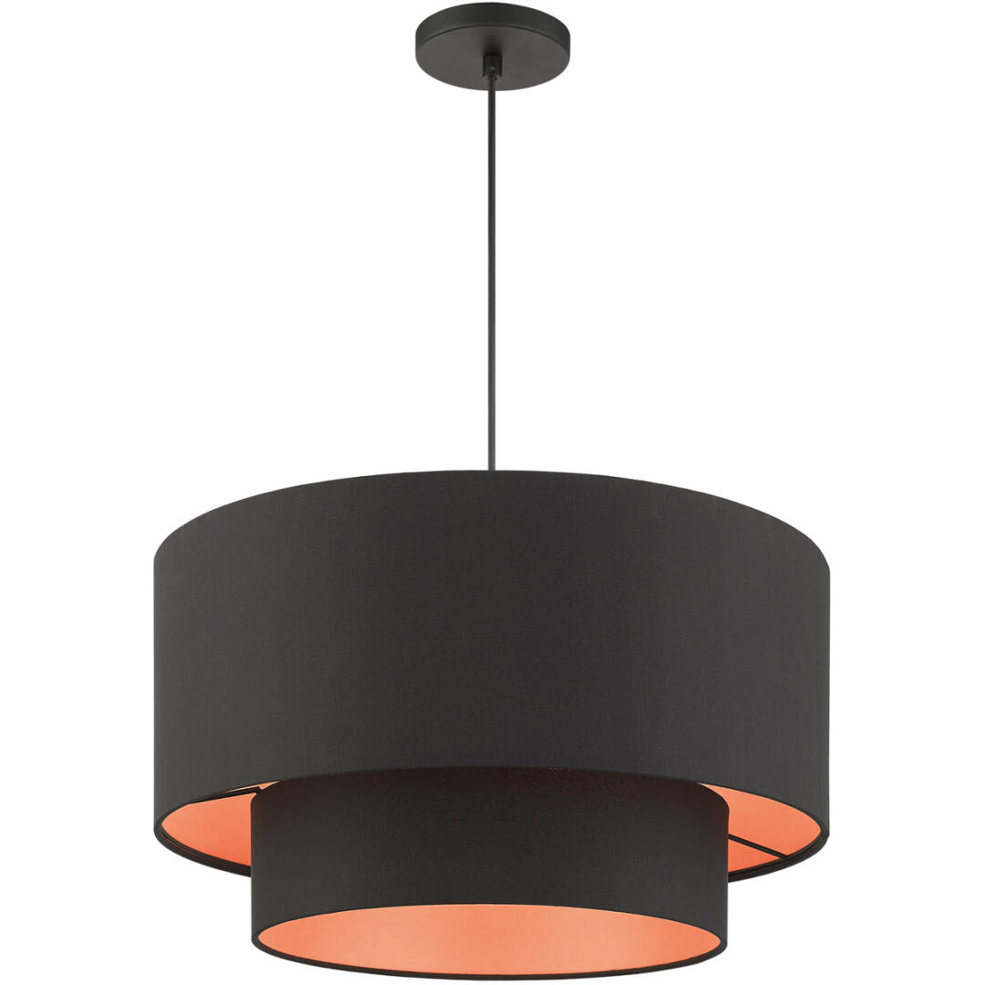 The Sentosa collection has a modern and retro appeal. The hand-crafted black fabric hardback shade is set off by the silky orange fabric on the inside creating an intriguing effect. The three-light double drum shade adds character to this handsomely styled pendant. Perfect fit for the living room, dining room, kitchen and bedroom. This sleek design is shown in a black finish.