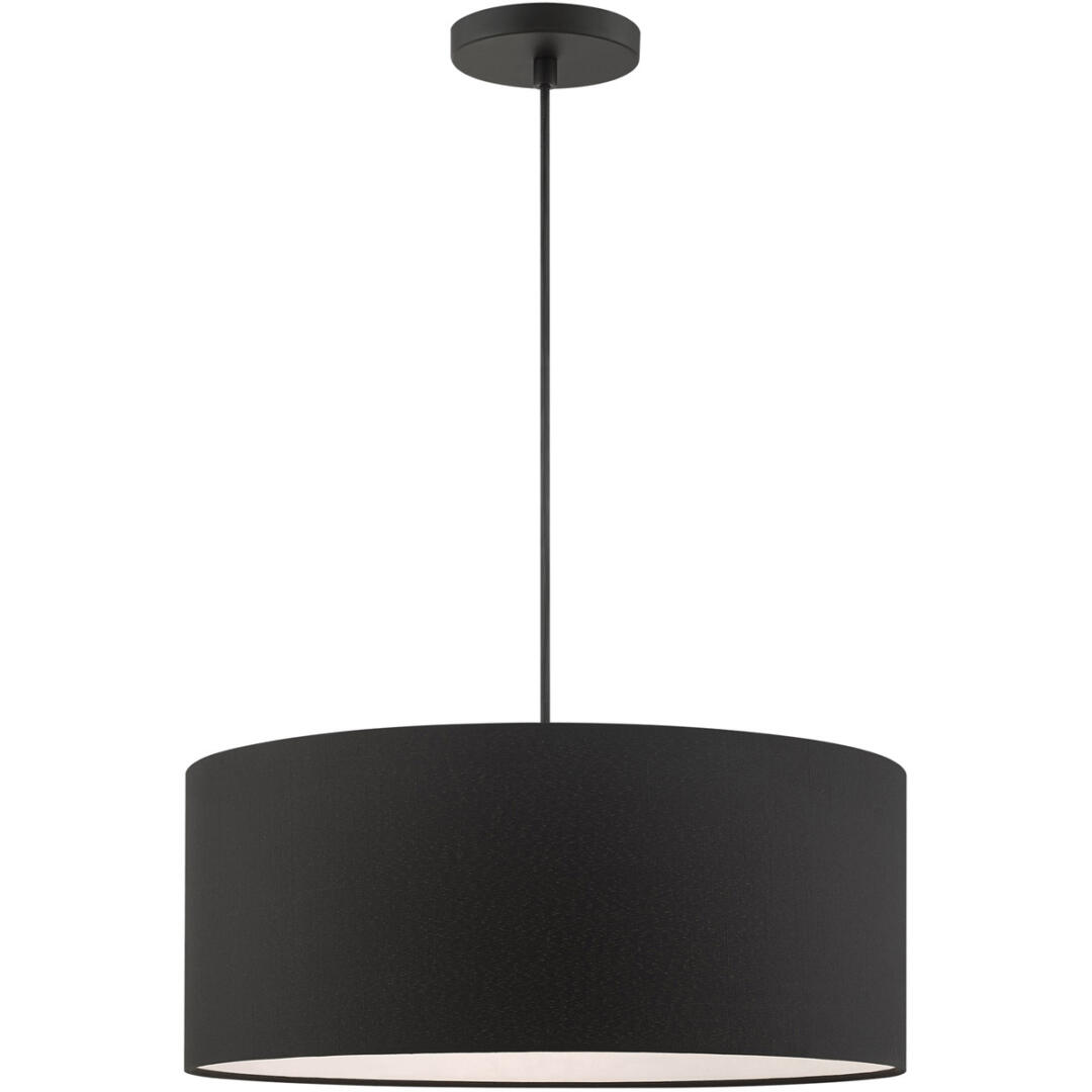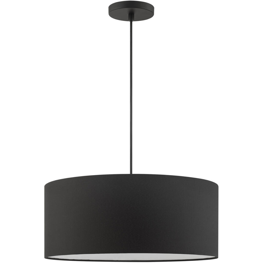 The Bainbridge collection is both modern and versatile. The hand-crafted black fabric hardback shade is set off by the silky white fabric on the inside setting a pleasant mood. The three-light drum shade adds character to this handsomely styled pendant. Perfect fit for the living room, dining room, kitchen and bedroom. This sleek design is shown in a black finish.