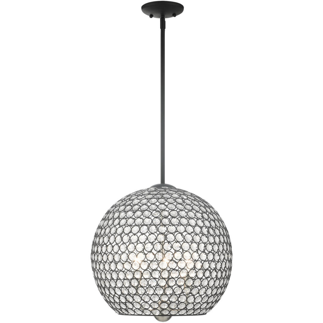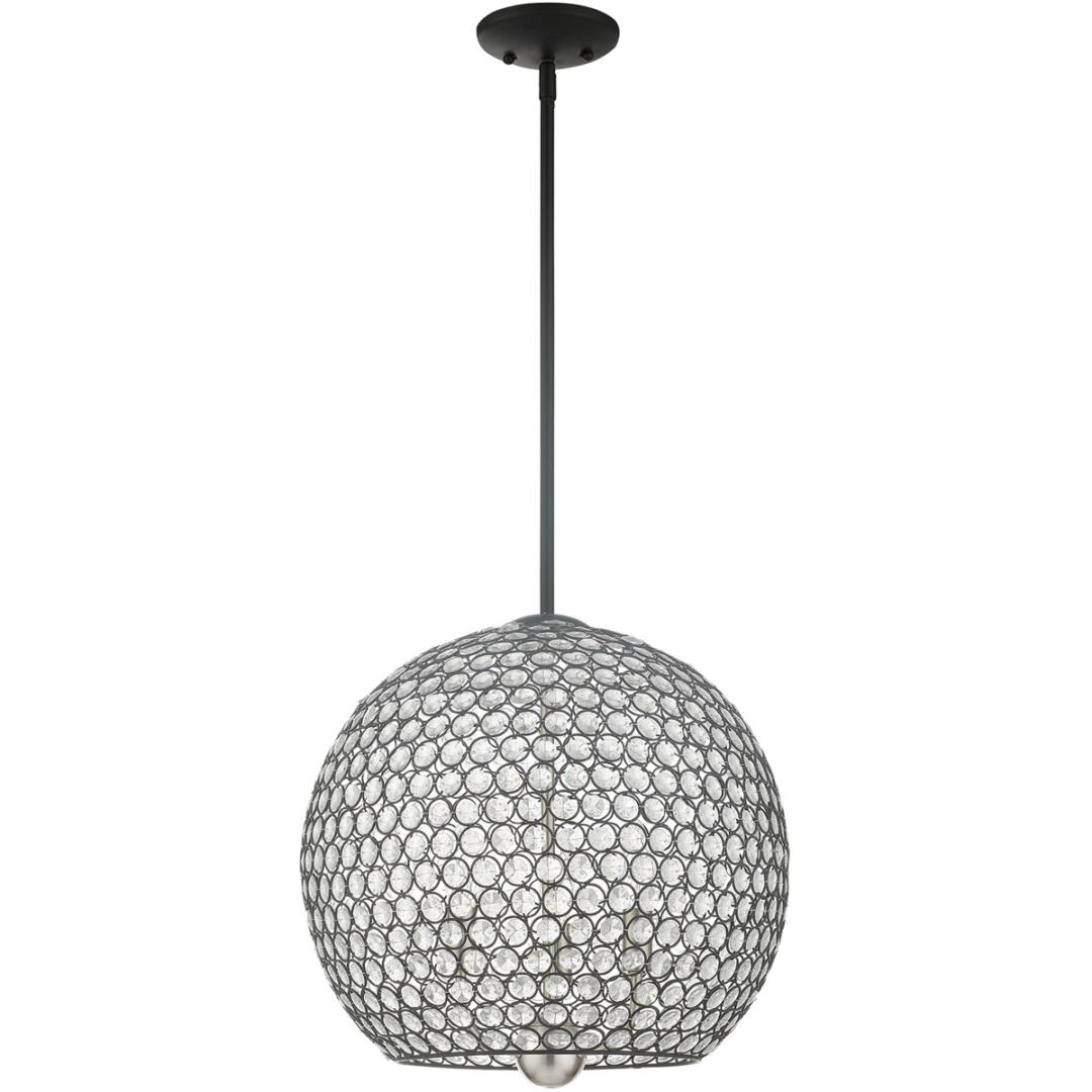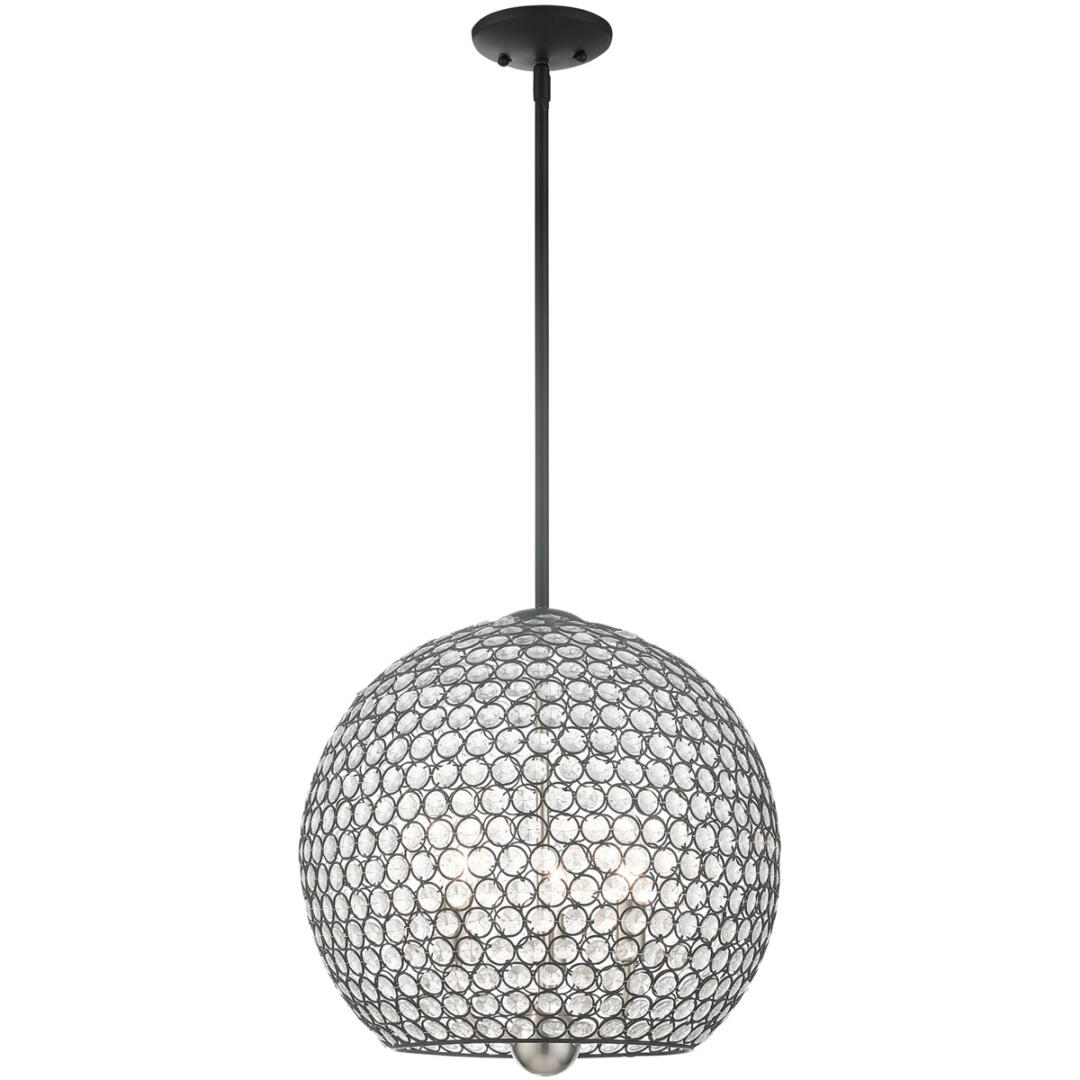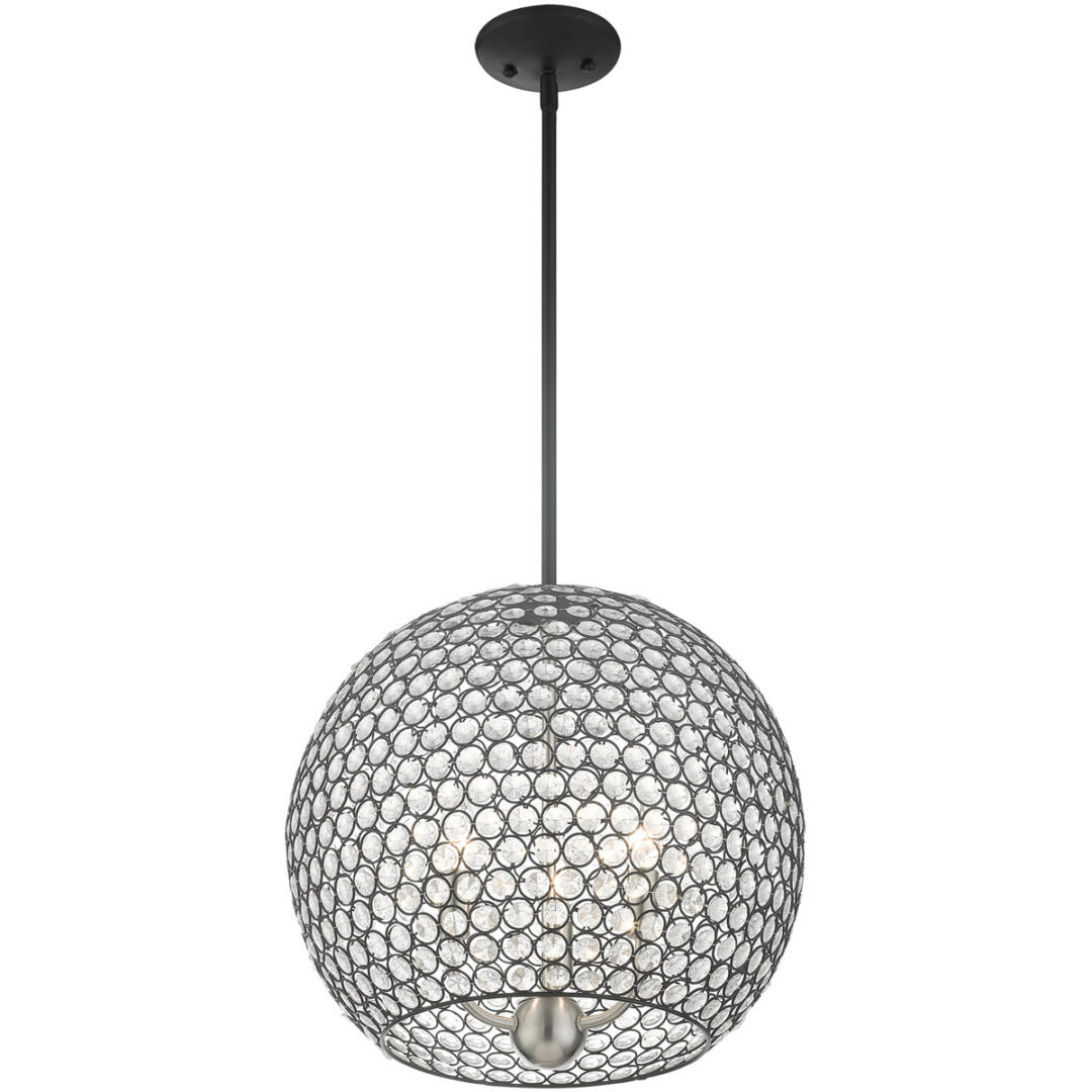 Cassandra features a dazzling array of K9 faceted crystal gems suspended within a modern frame. Light artfully reflects and refracts through these elements to provide a dramatic focal point to any room. This three-light globe crystal pendant will add an unmistakable touch of elegance to your dining room, kitchen or a bedroom. It is shown in a black finish with a brushed nickel finish cluster.