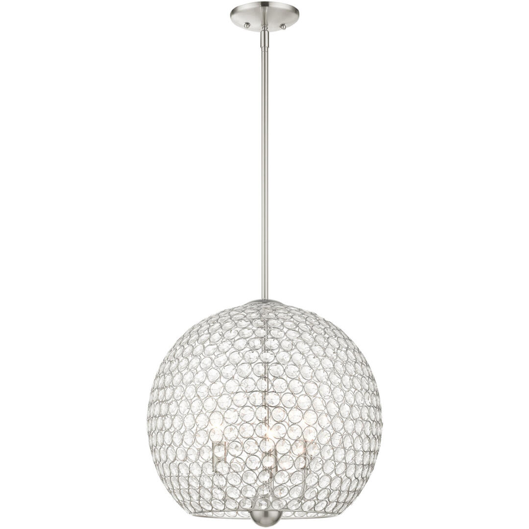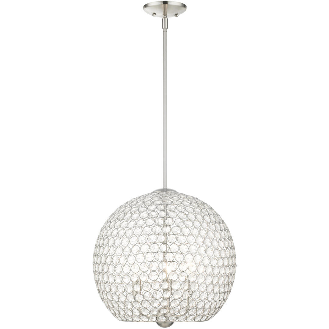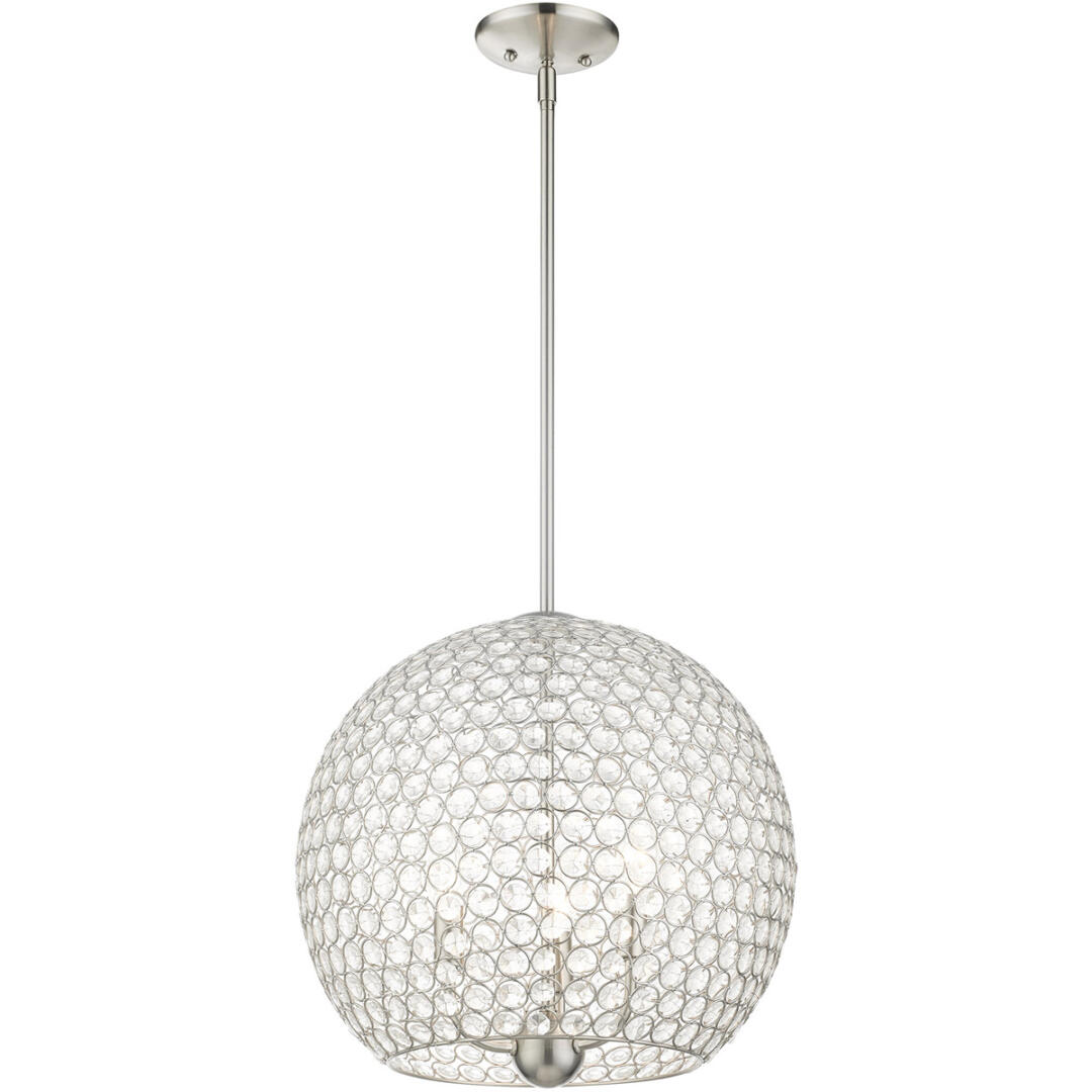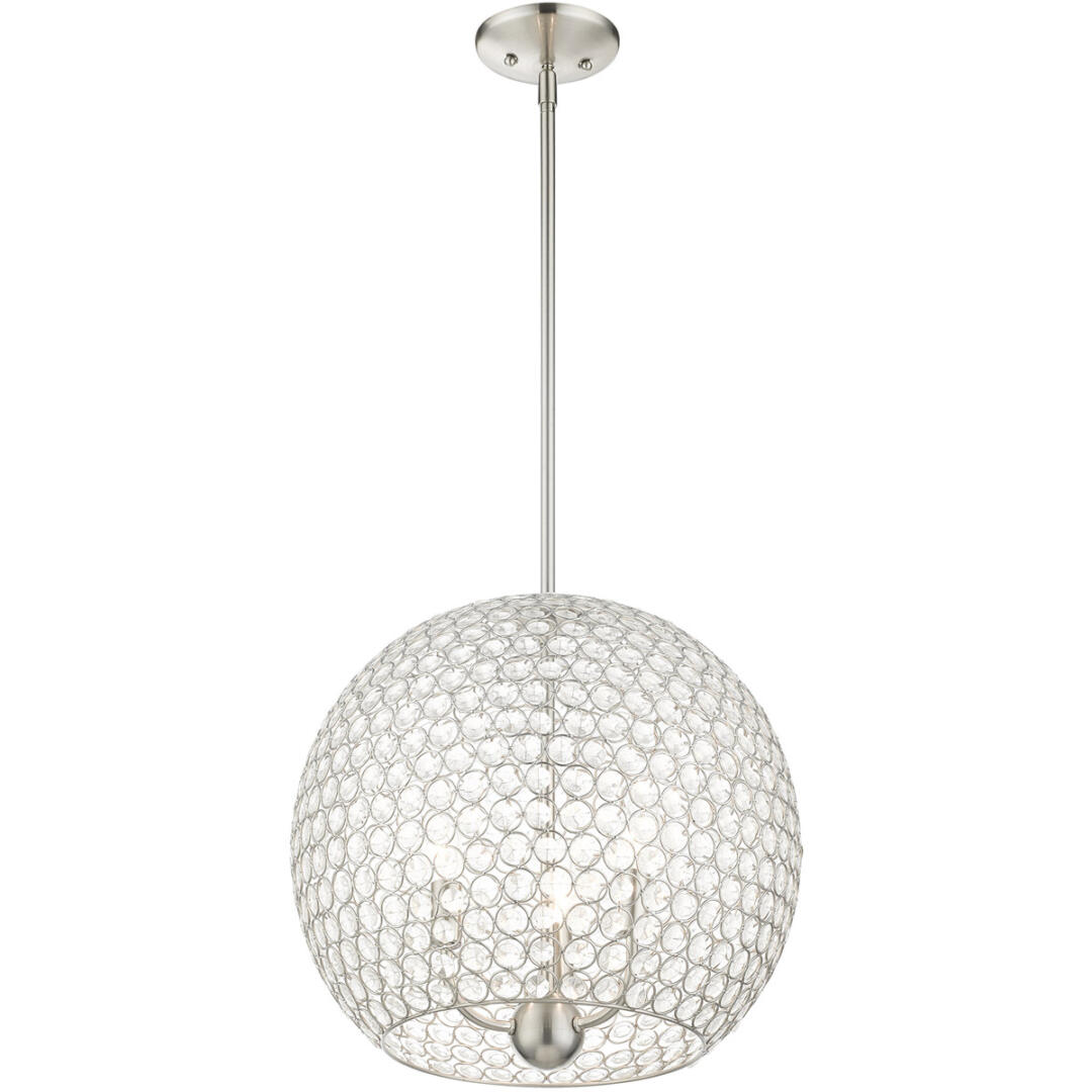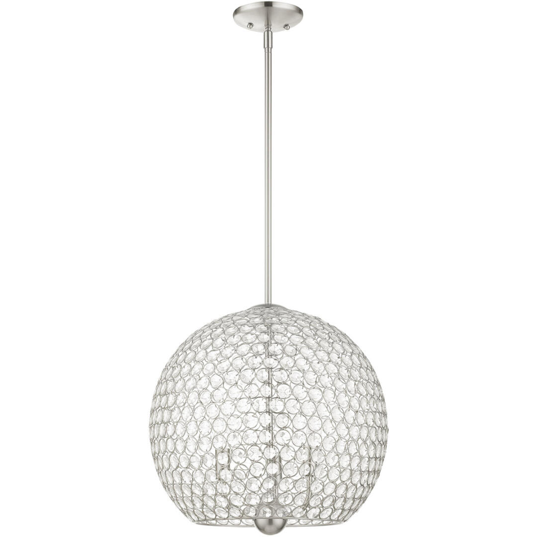 Cassandra features a dazzling array of K9 faceted crystal gems suspended within a modern frame. Light artfully reflects and refracts through these elements to provide a dramatic focal point to any room. This three-light globe crystal pendant will add an unmistakable touch of elegance to your dining room, kitchen or a bedroom. It is shown in a brushed nickel finish.