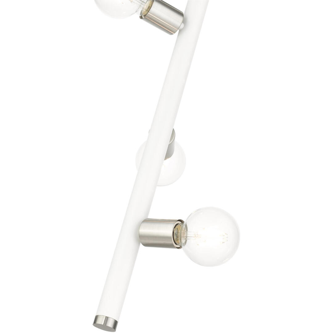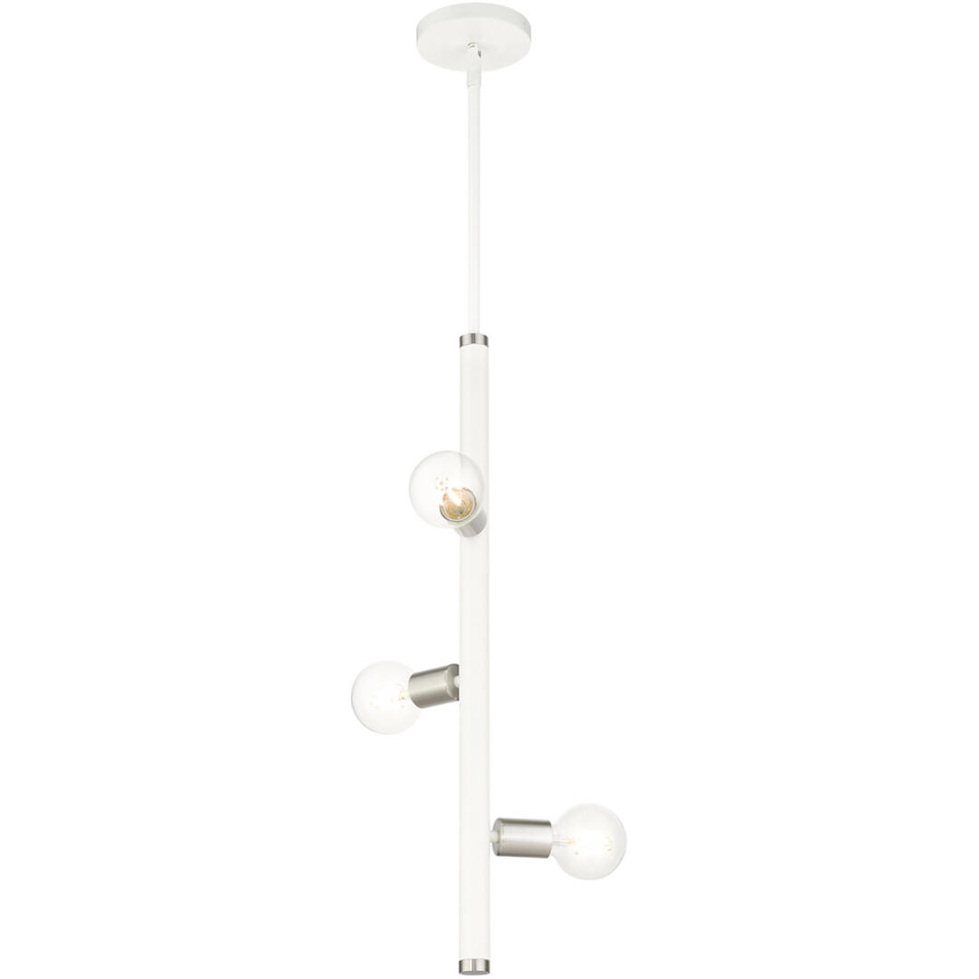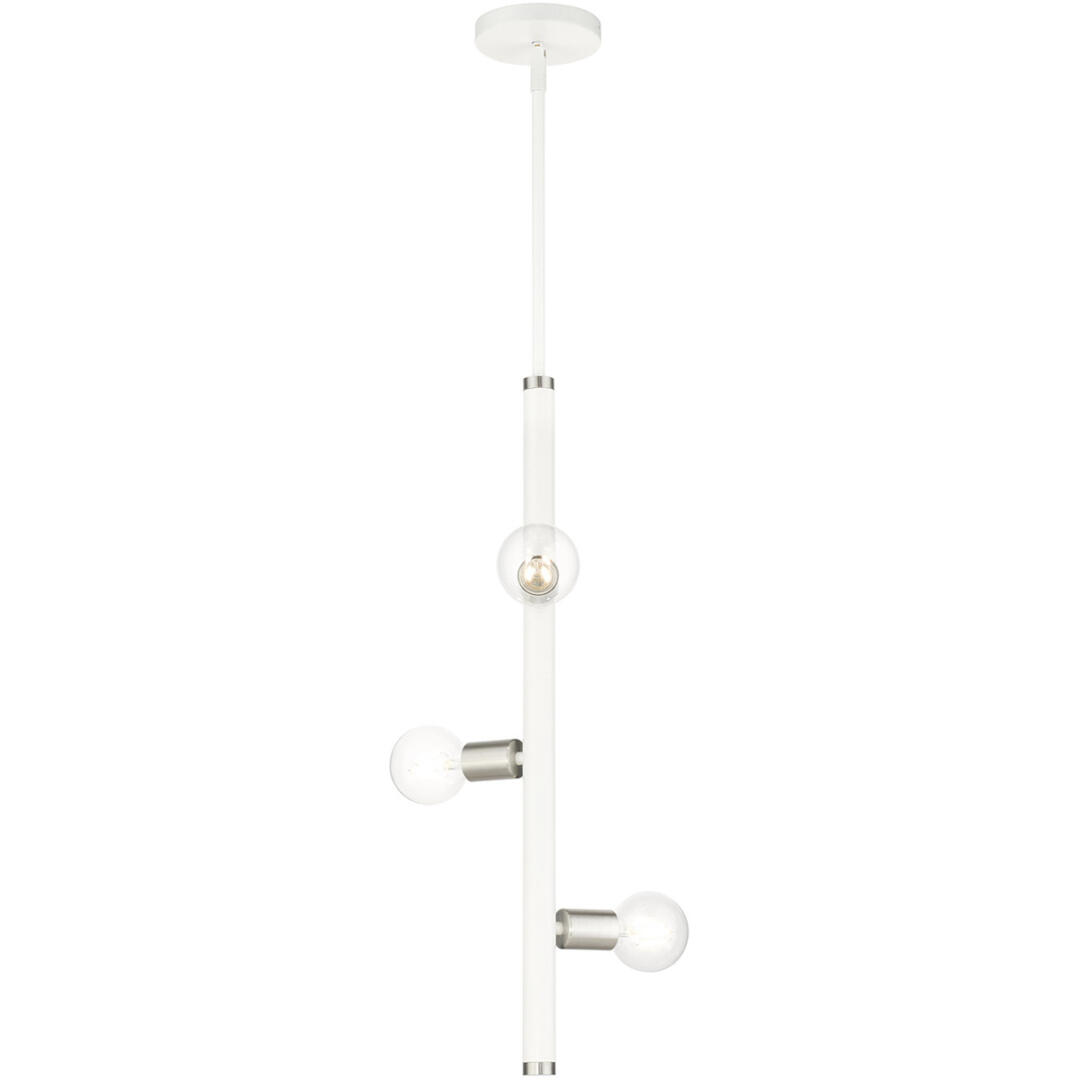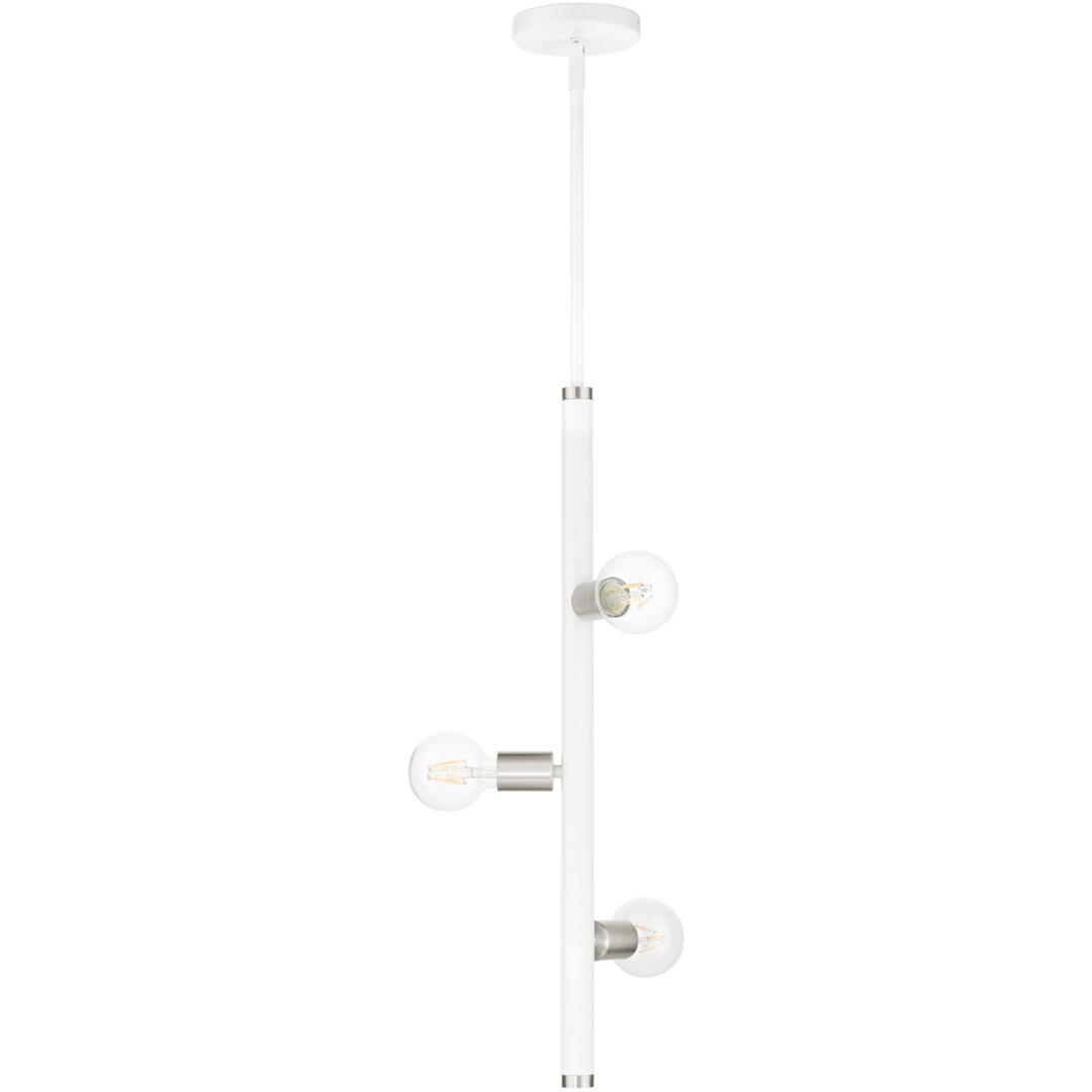 Simplicity and attention to detail are the key elements of the Bannister collection. The dimensional form, exposed bulbs and combination of finishes adds a playful mood to a contemporary or urban interior. This three-light asymmetrical pendant design gives a new face to a kitchen, bedroom or a bathroom vanity. It is shown in a white finish with brushed nickel accents.
