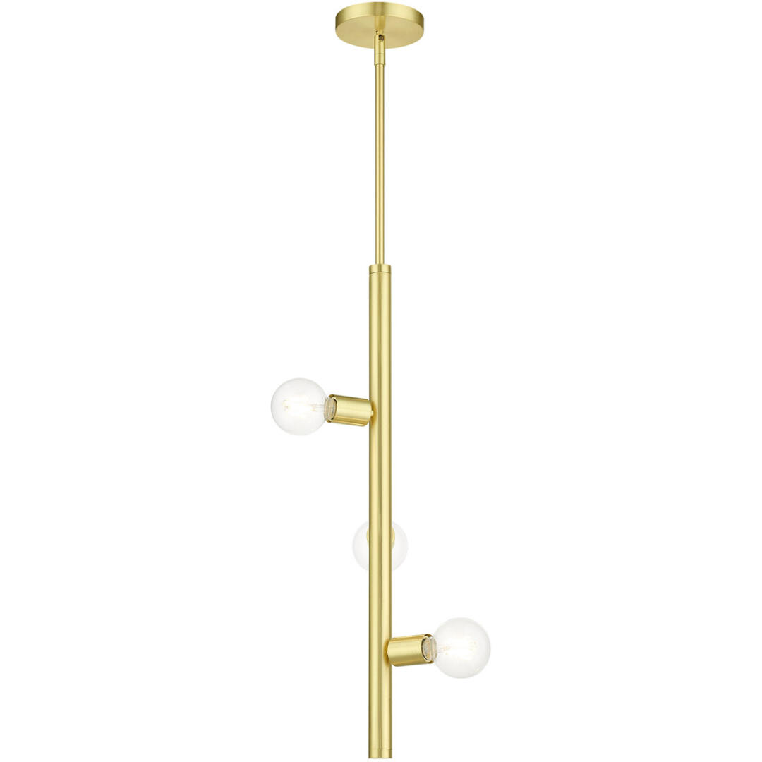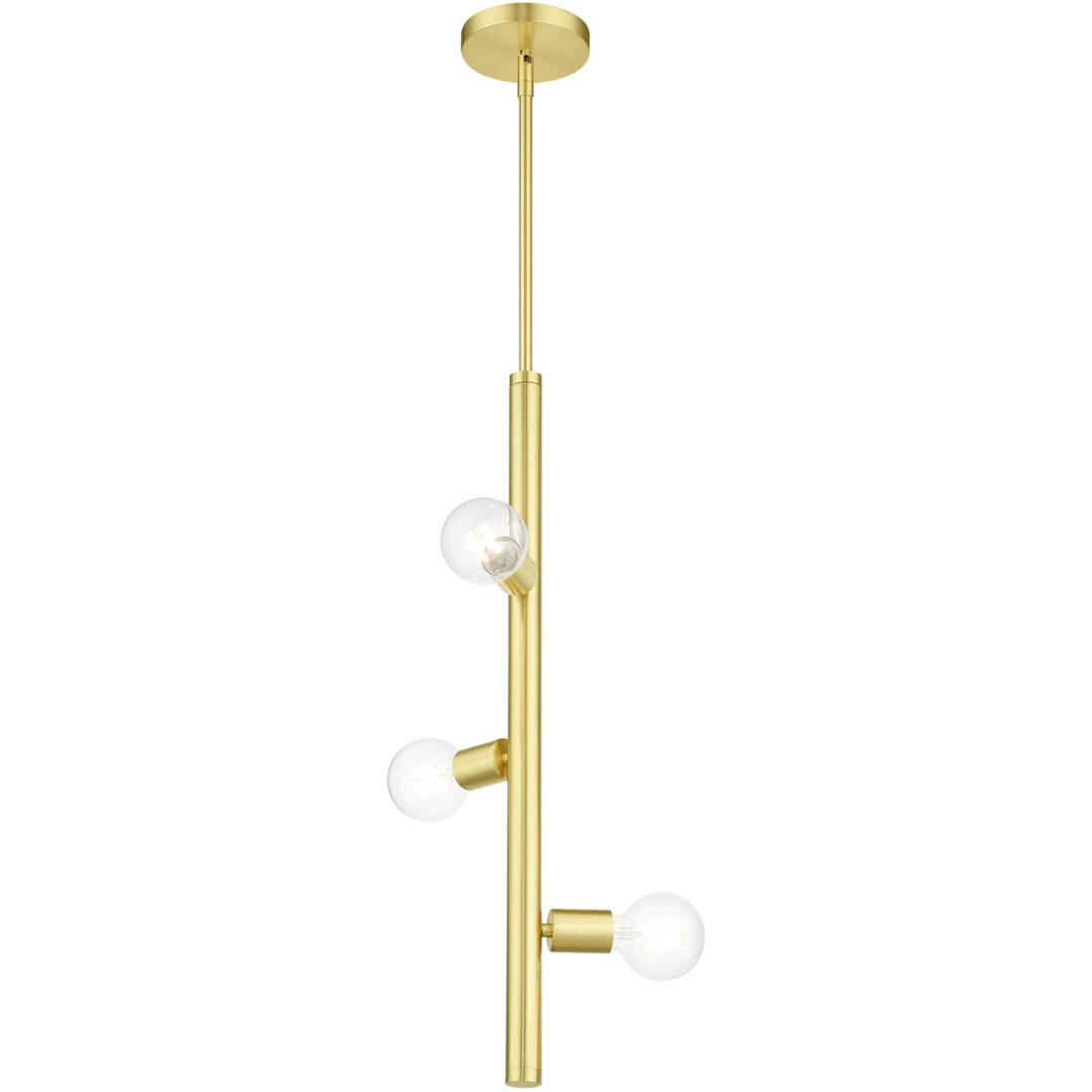 Simplicity and attention to detail are the key elements of the Bannister collection. The dimensional form, exposed bulbs and combination of finishes adds a playful mood to a contemporary or urban interior. This three-light asymmetrical pendant design gives a new face to a kitchen, bedroom or a bathroom vanity. It is shown in a satin brass finish.