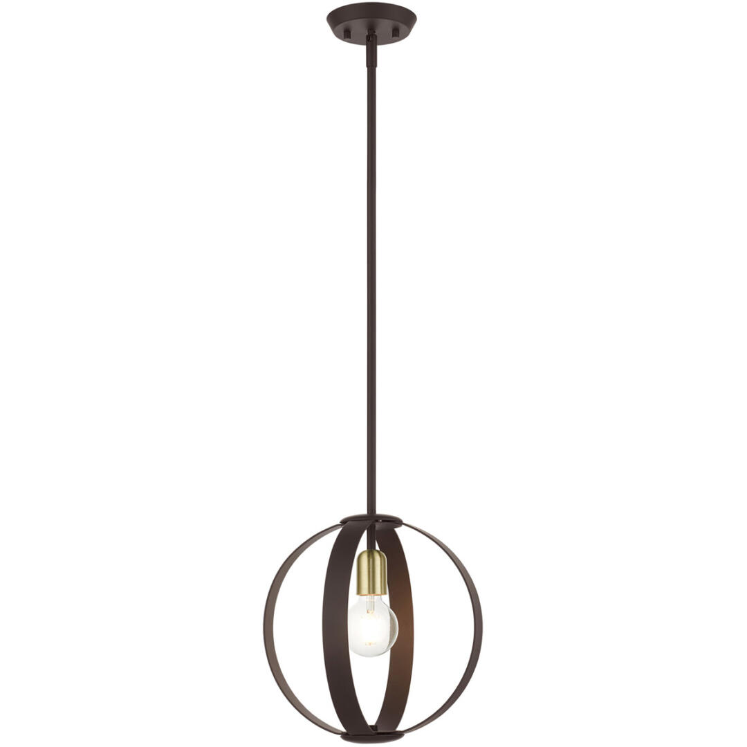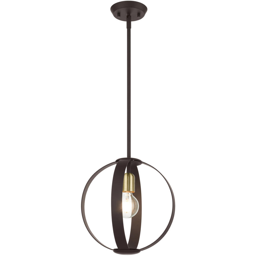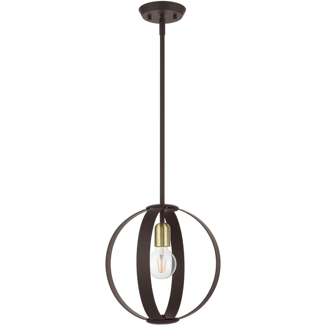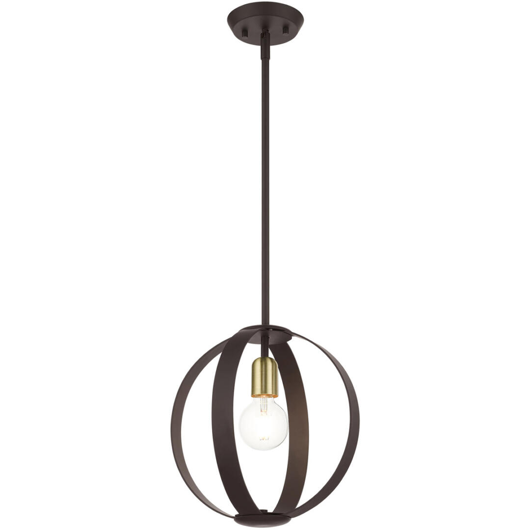 The Modesto collection hints at a casual mid-century modern vibe. It features steel straps that form beautiful circular shapes. The exposed bulbs and two-toned combination of finishes create a fashionable statement for today’s interiors. This single-light globe pendant is shown in a bronze finish with satin brass accents. It will look fantastic in your mid-century modern loft, dining room, over the kitchen countertop, bedroom, bathroom or any contemporary style interior.