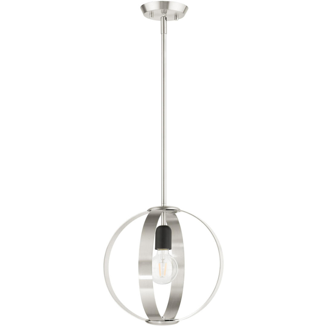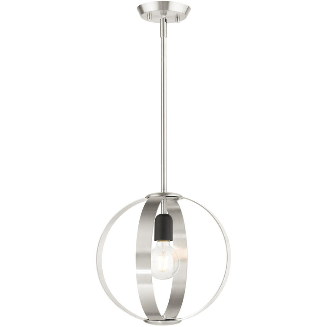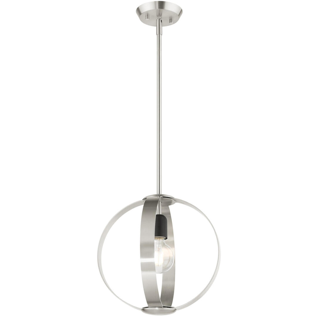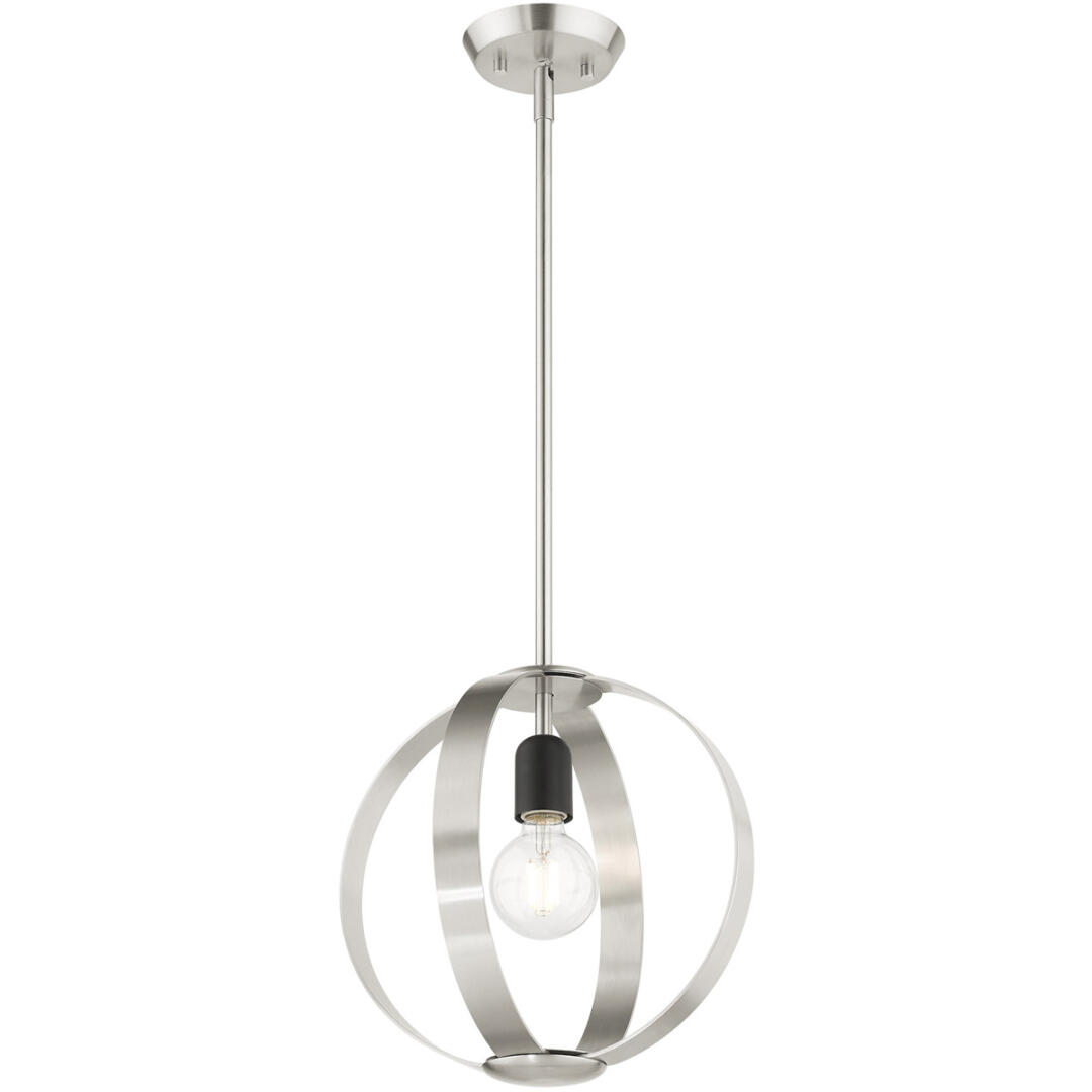 The Modesto collection hints at a casual mid-century modern vibe. It features steel straps that form beautiful circular shapes. The exposed bulbs and two-toned combination of finishes create a fashionable statement for today’s interiors. This single-light globe pendant is shown in a brushed nickel finish with black accents. It will look fantastic in your mid-century modern loft, dining room, over the kitchen countertop, bedroom, bathroom or any contemporary style interior.