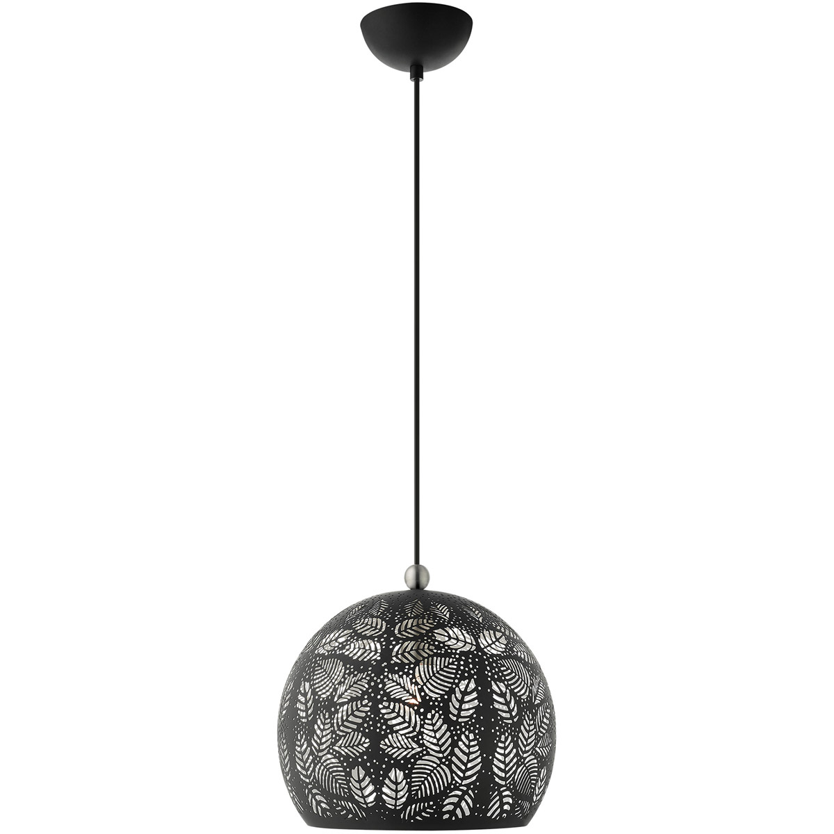 Chantilly features a beautiful black finish with brushed nickel finish accents. Light artfully reflects and refracts through the filigreed leaves to provide a dramatic focal point to any room. This small one-light pendant will add an unmistakable touch of elegance to your dining room, kitchen or a bedroom.