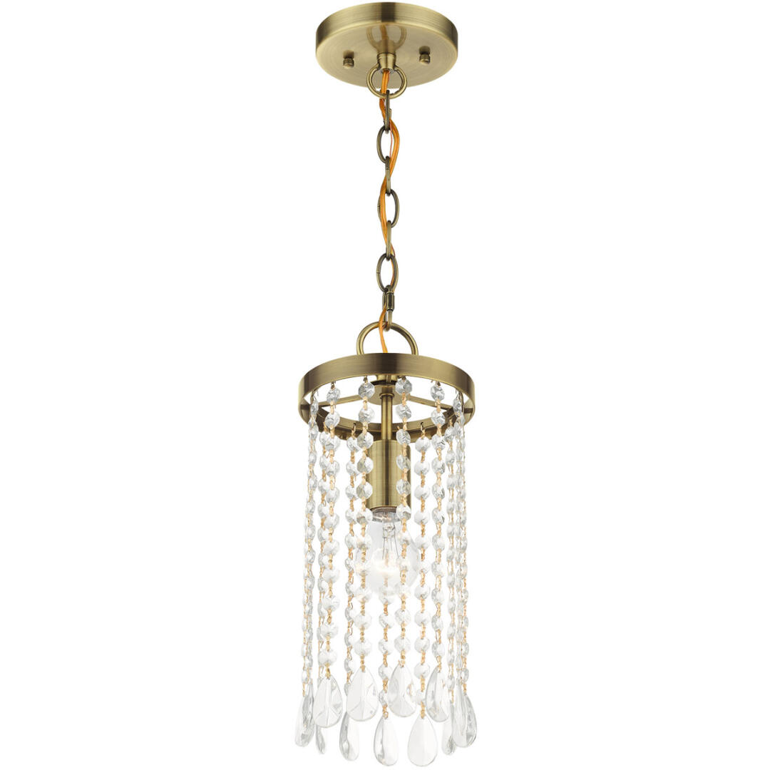 Decorative finishes complete the beautiful Elizabeth series with a refined quality. Clear crystal frills offer detailed elegance to the design of this single-light antique brass pendant chandelier. Attract attention with the bold personality provided by this lovely fixture which is perfect for your dining room, kitchen, next to bathroom vanity or over the bedroom nightstand.