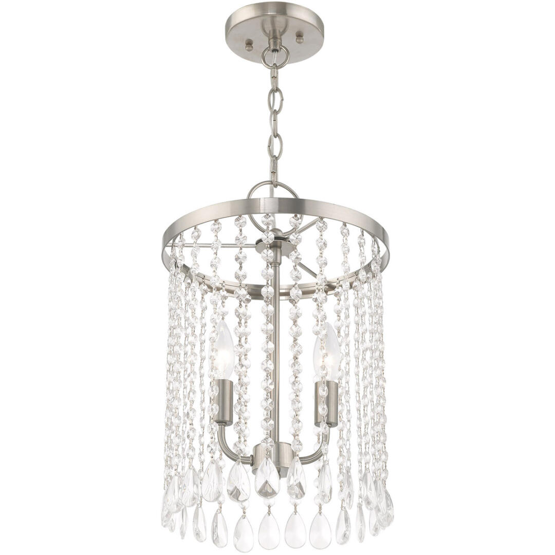 The brushed nickel finish decorates the beautiful design of the Elizabeth two light mini pendant chandelier with a refined quality. Clear crystal frills offer detailed elegance to the design of this mini pendant. Attract attention with the bold personality provided by this lovely fixture.