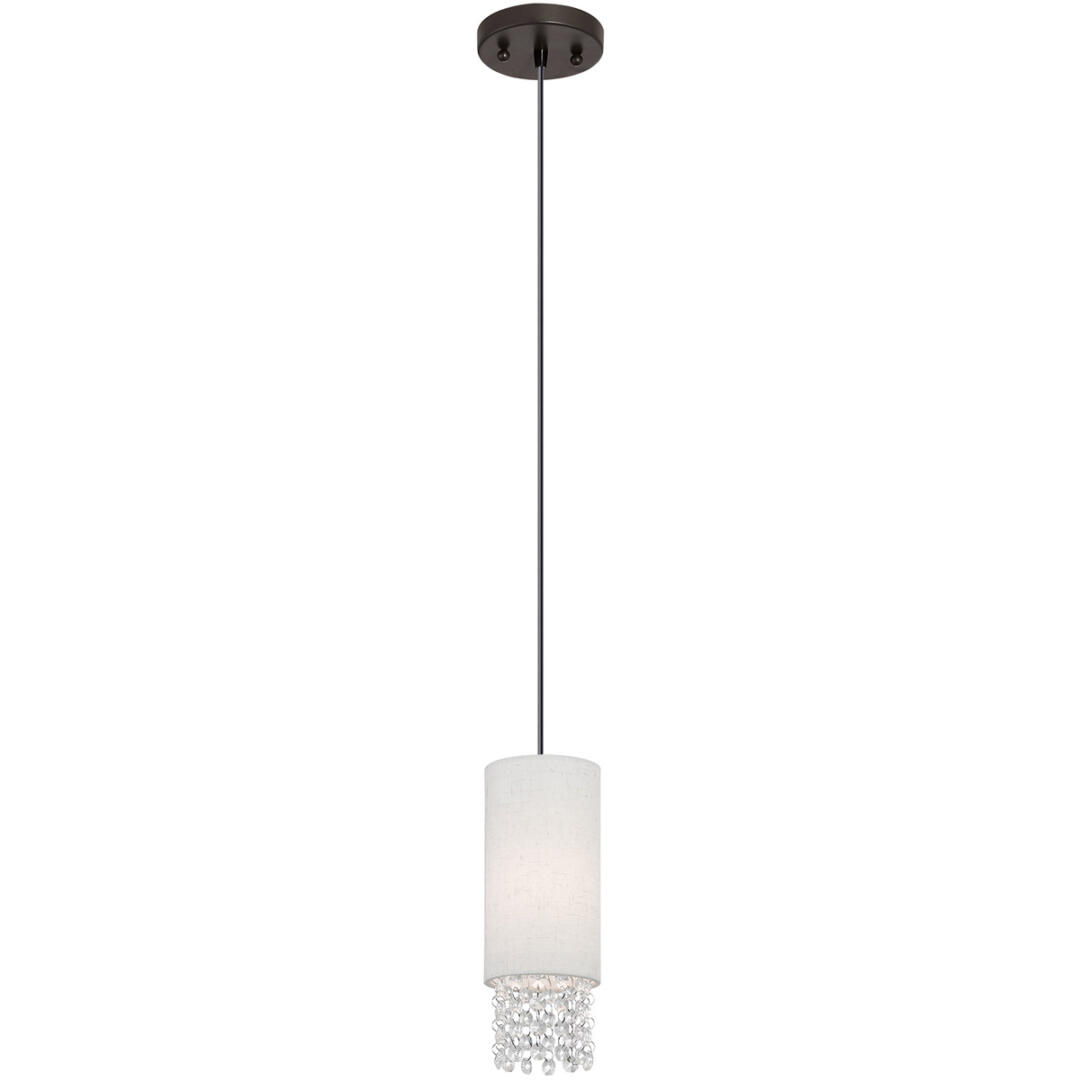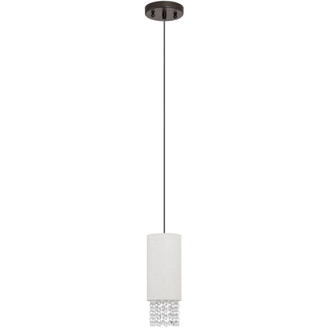 This contemporary style mini pendant from the Carlisle collection features an English bronze finish with hanging strands of beautiful clear crystals. The crystal drapes from a hand crafted oatmeal fabric hardback shade and creates a magnificent sophisticated look.