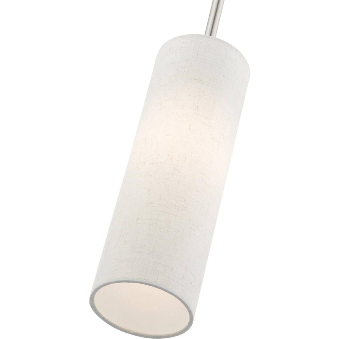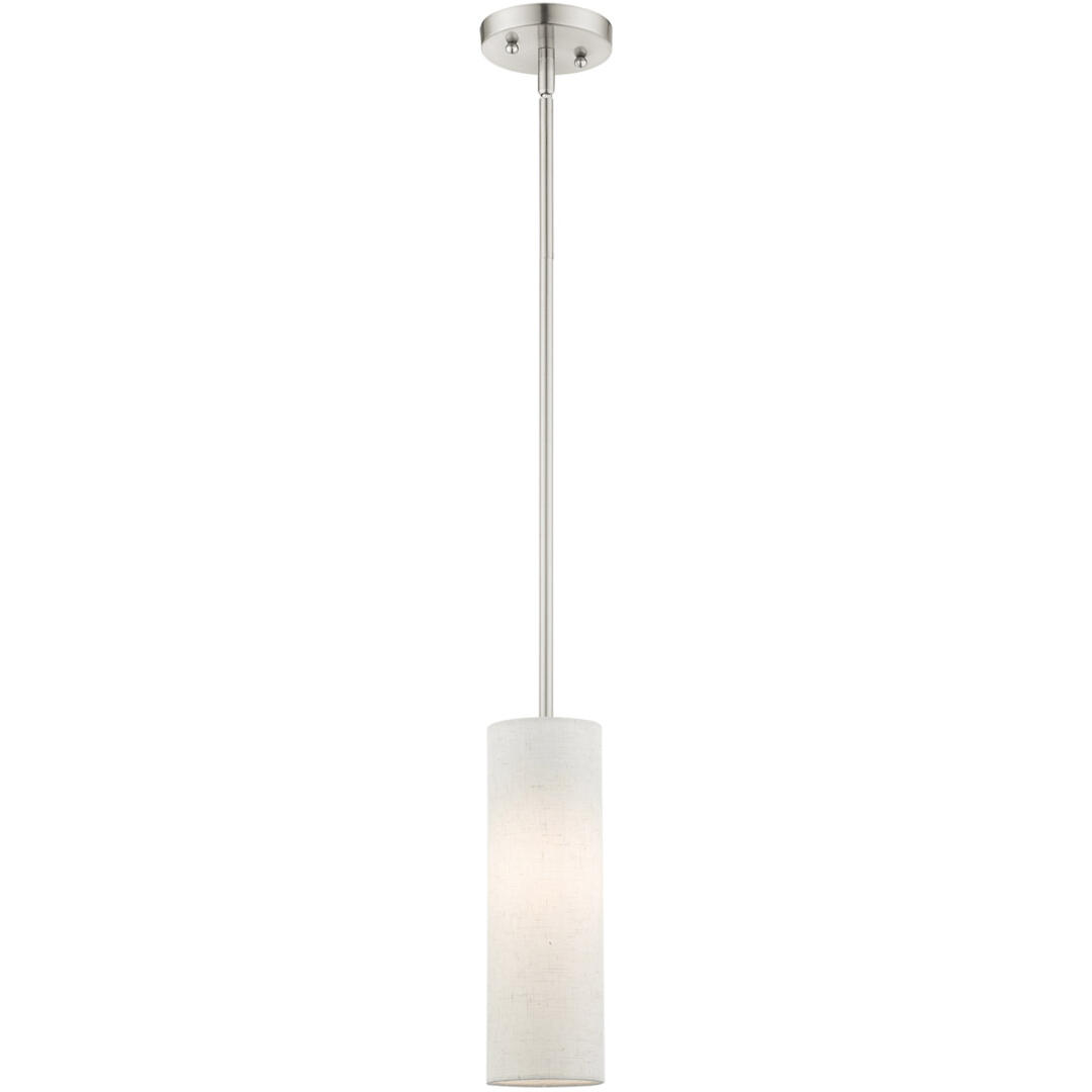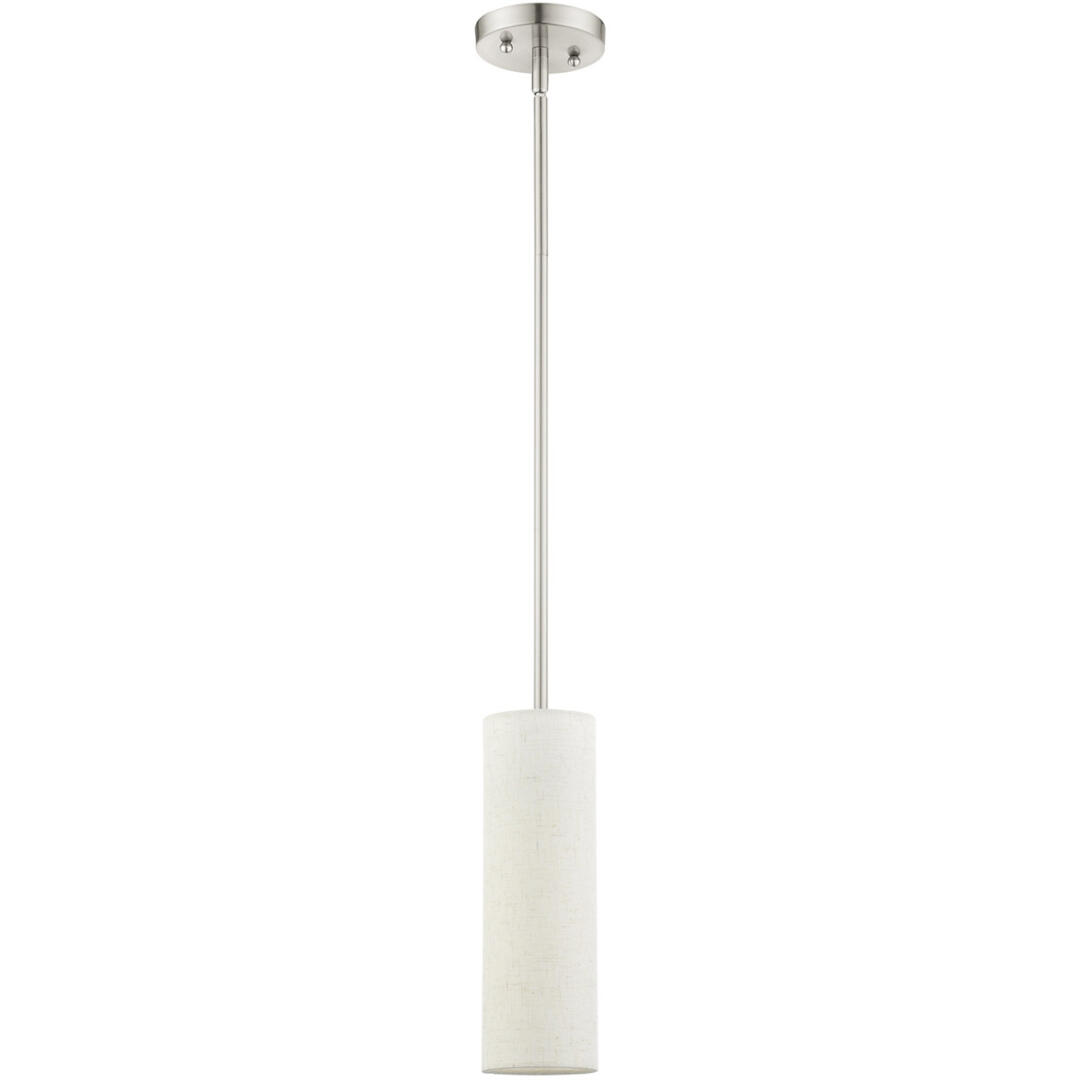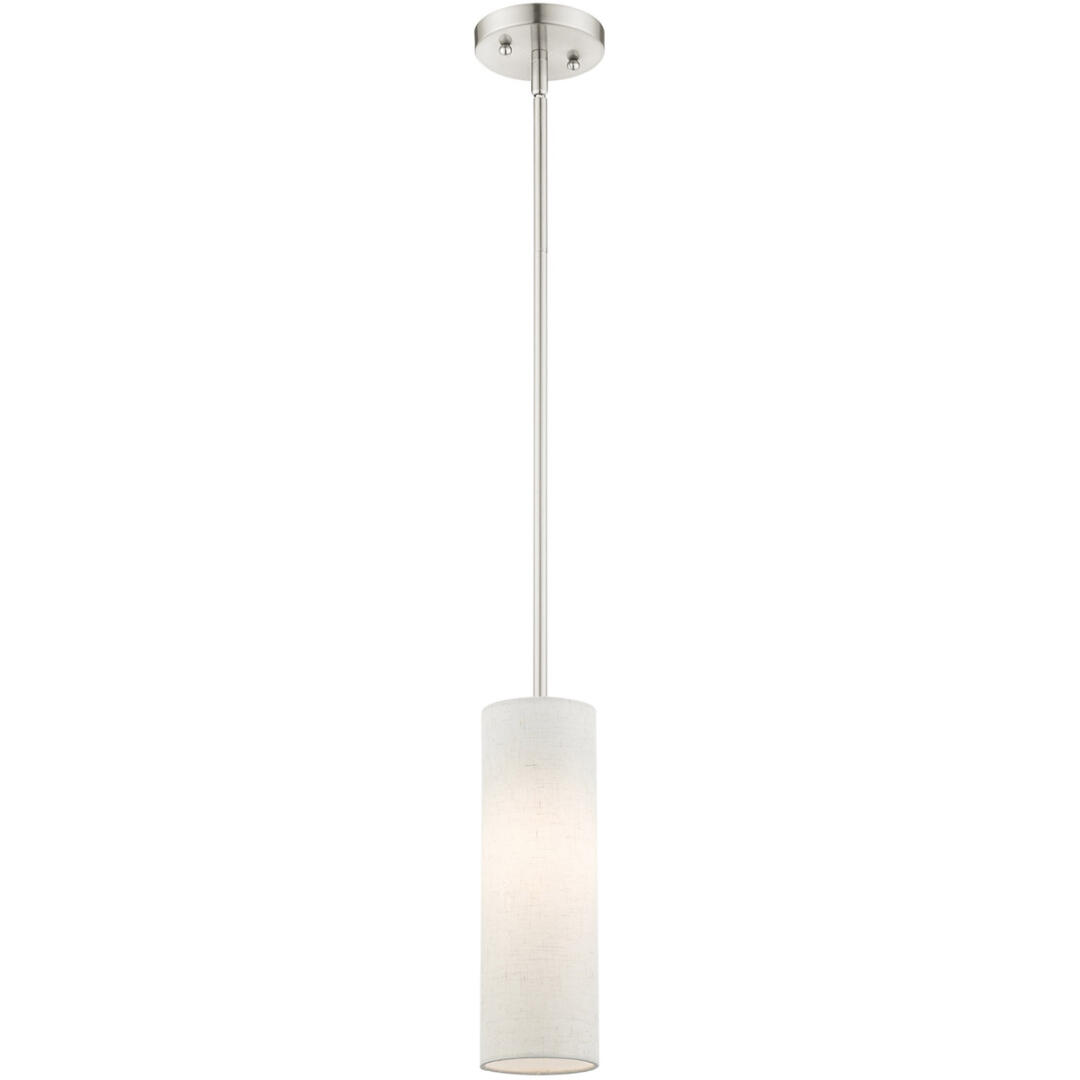 A single drum shade adds character to this handsomely styled mini pendant light. Update your decor with the clean styling of this contemporary one light mini pendant from the Meridian collection. Features a lovely hand crafted oatmeal color fabric hardback shade and frosted diffuser for subtle illumination.