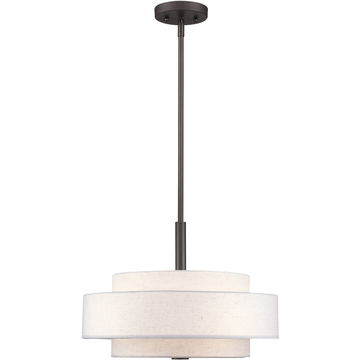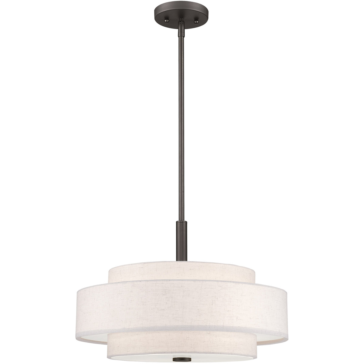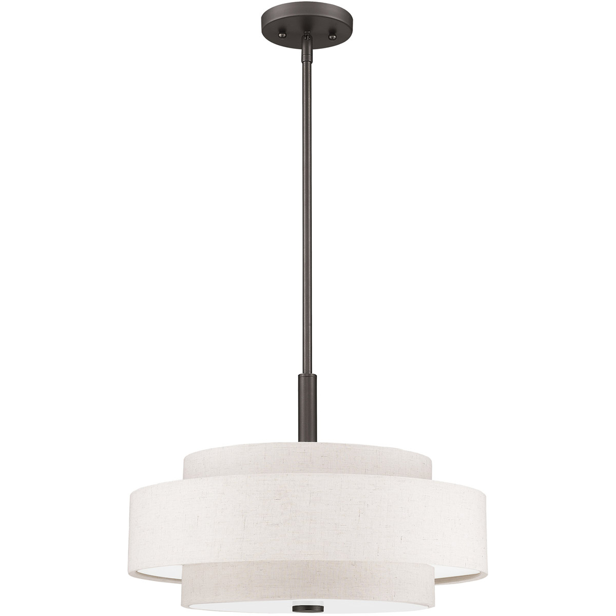A triple drum shade adds character to this handsomely styled pendant light. Update your decor with the clean styling of this contemporary four light pendant from the Monroe collection. Features a lovely hand crafted oatmeal color fabric hardback shade and frosted diffuser for subtle illumination.