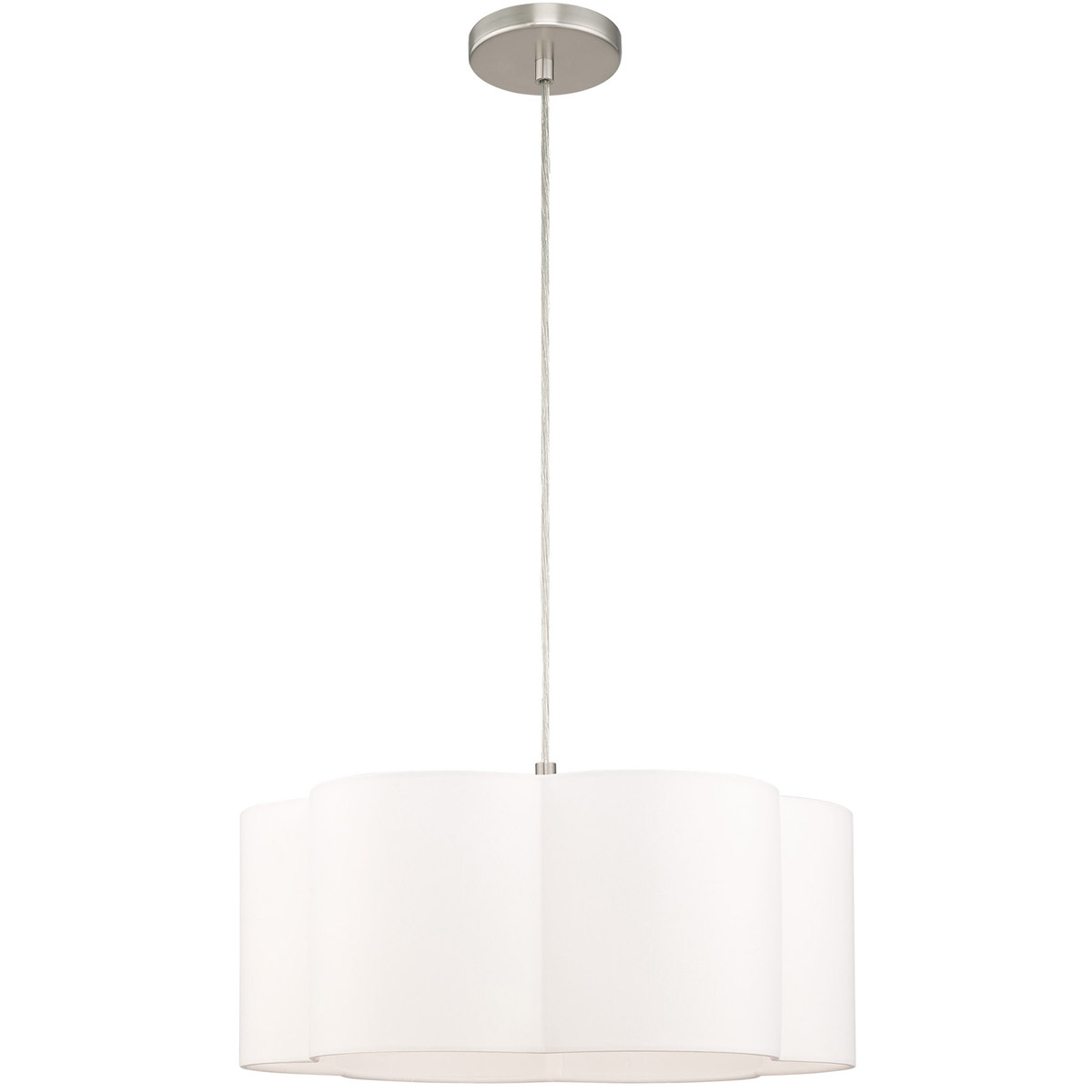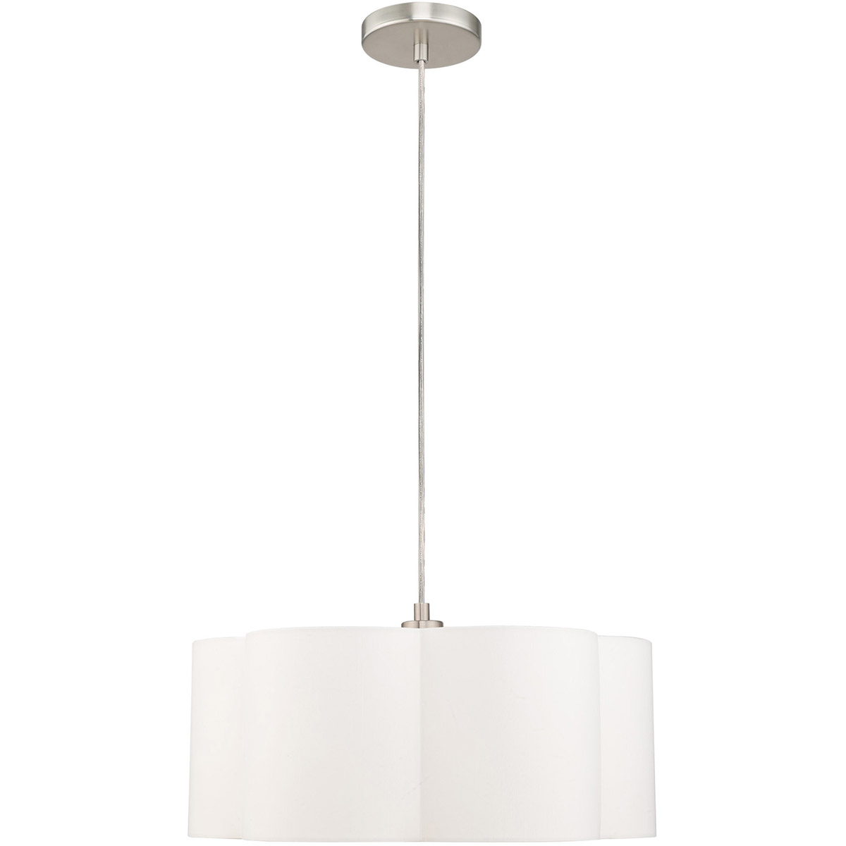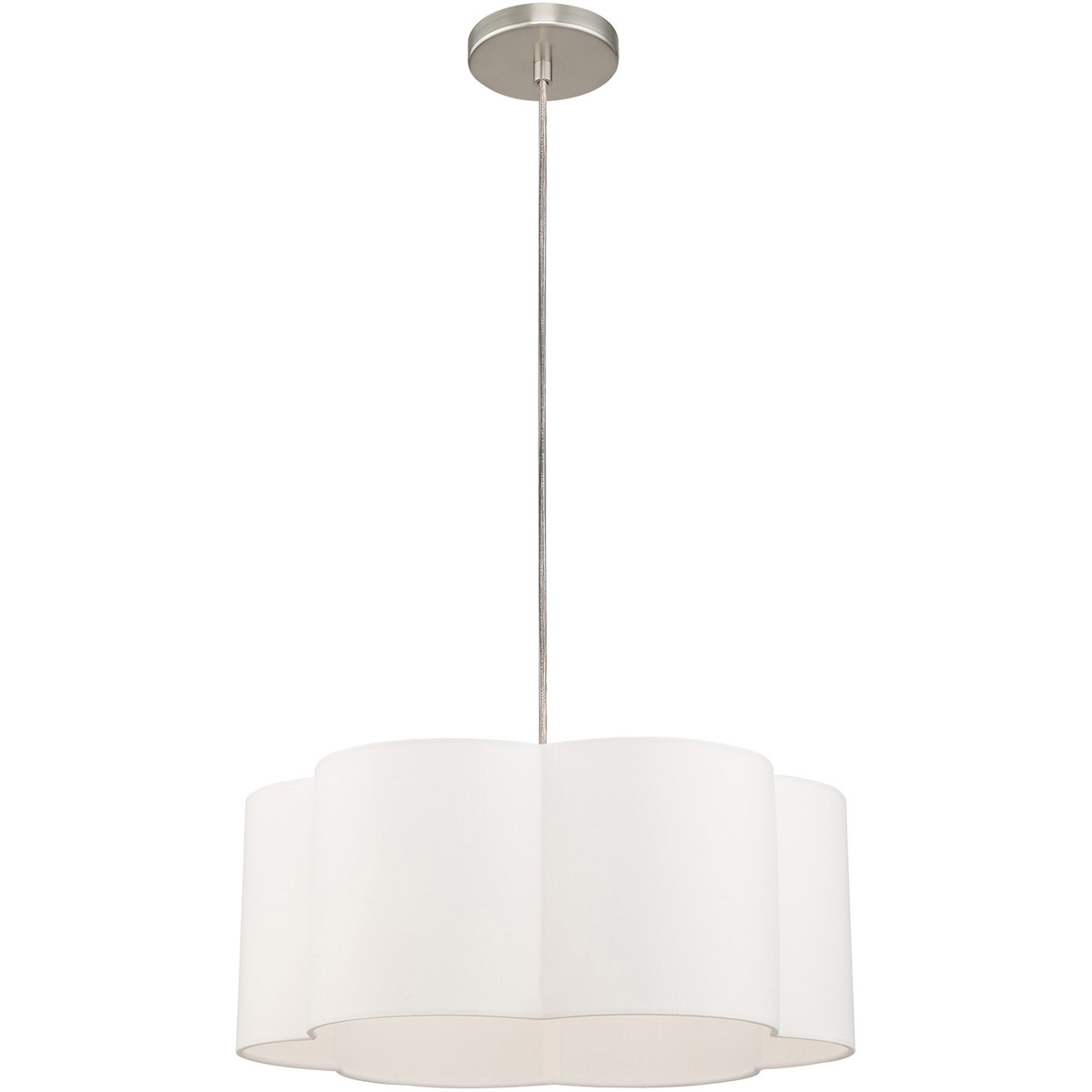 The Chelsea one light pendant features a beautiful hand crafted flower shaped, off-white hardback shade situated on a brushed nickel frame. It will be the perfect pick for a traditional to contemporary style.
