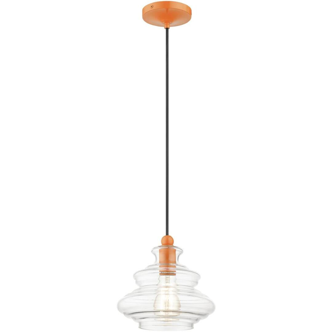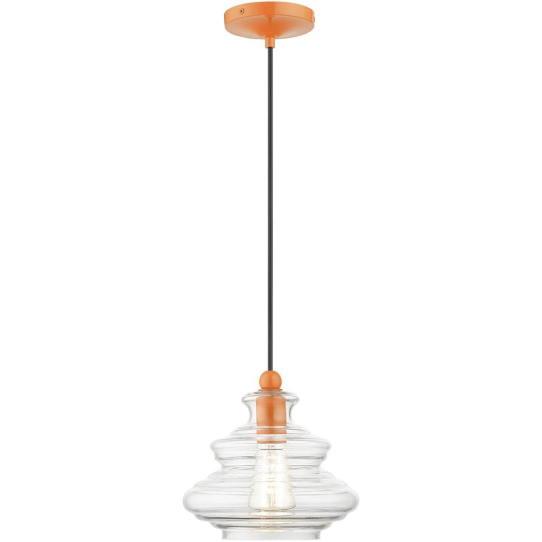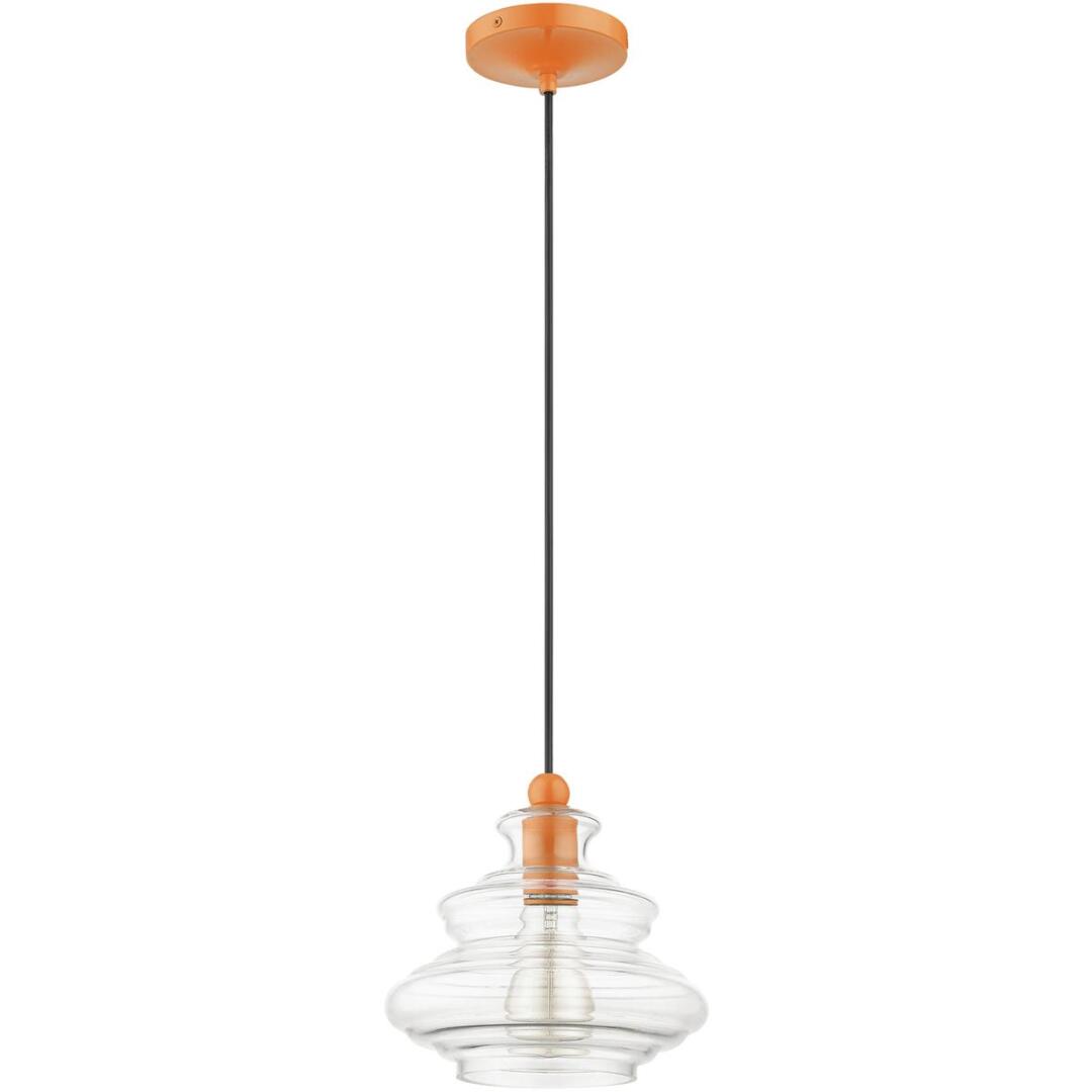 The Everett single light pendant suspends simply, and it’s great solo over focus points or set in pairs or trios over long counter tops and islands. It is showcased in a shiny orange finish with hand blown clear art glass.