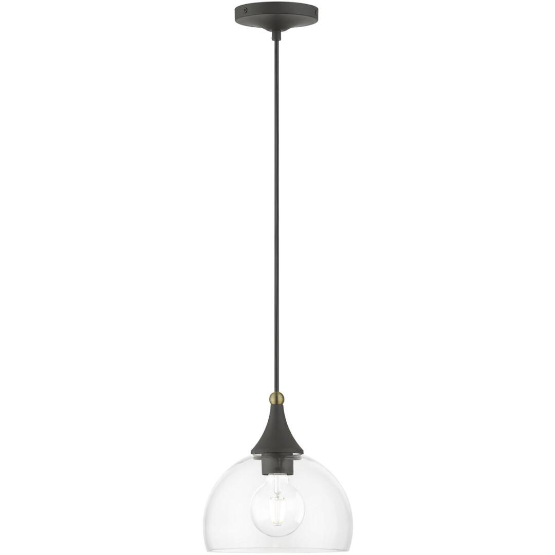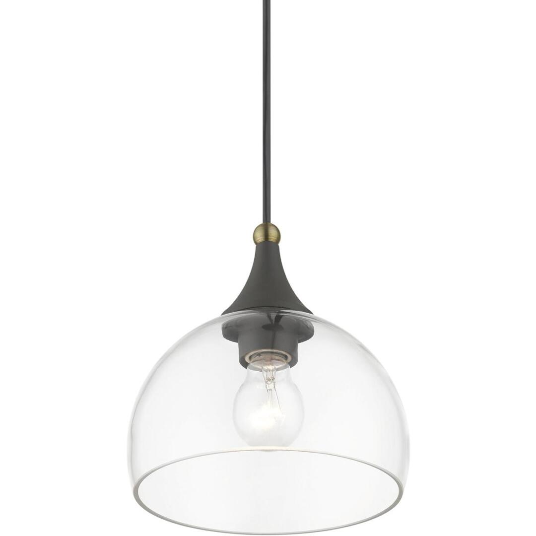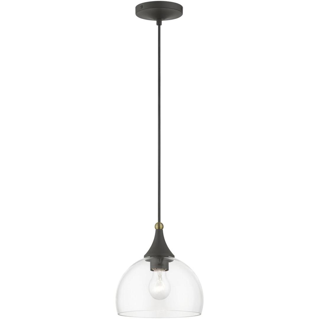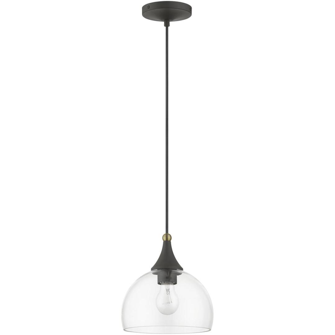 This single pendant from the Glendon collection has understated elegance. It features minimal details, clear curved glass with a bronzefinish and can fit into any decor.