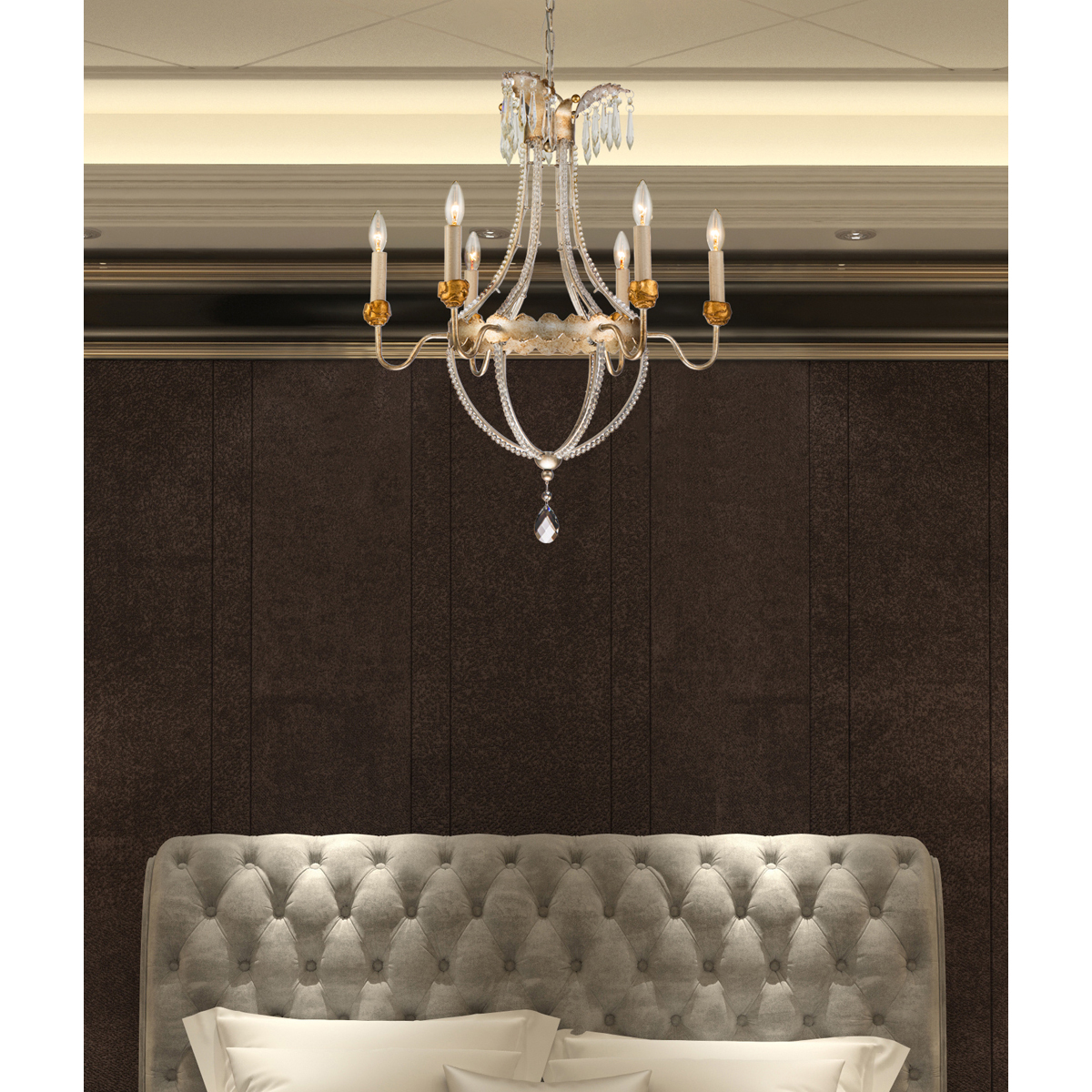 The stunning classic French-empire style chandelier blends a traditionally designed shape with modern finishes. Multiple rows of clear crystal beads grace the metal frame of this elegant and contemporary chandelier finished in an distressed gold and silver mix. Six candlestick lamps with weathered gold shaped bobeches and a traditional shape give this Lucas McKearn classic a favorite status. Design elements include the unique mix of finishes, charming shape and French vintage inspired accents combined into a traditional piece that is on-trend for the updated traditional style that is at the top of all the design trends.