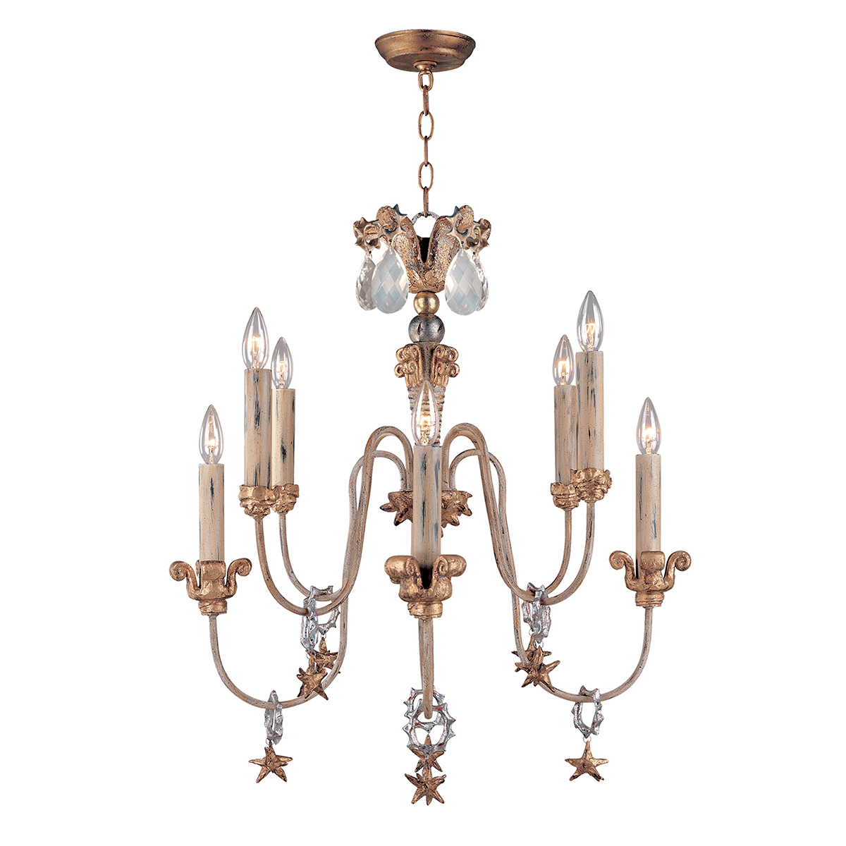 Flambeau’s Mignon 8 light chandelier is often called the whimsical star chandelier because of the beautiful sculpted resin “stars” that adorn this lovely and charming chandelier. Whether Boho Chic or French decor this chandelier’s wrought iron frame finished in a distressed ivory features unique hand painted resin pieces that are used to hold the candle sleeves in place as well as a little crystal at the top to finish the whimsical feel. Place in a dining room or kitchen for a touch of glam, and definite conversation piece. Add a bit of whimsy to your nursery or playroom, or a sophisticated mix of gold and silver which makes this 8 light chandelier able to work in many spaces bringing a charming New Orleans feel to any room.