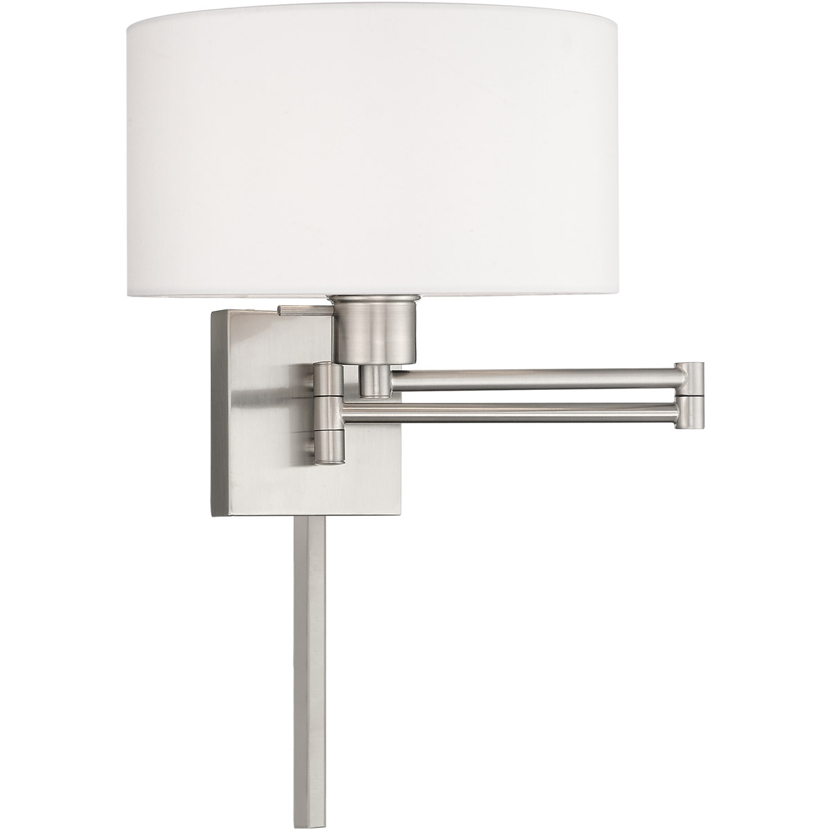 Add this versatile swing arm wall lamp bedside or above a favorite reading chair to enjoy more light where you need it. The brushed nickel finish is transitional while the off-white fabric shade offers subtle texture.