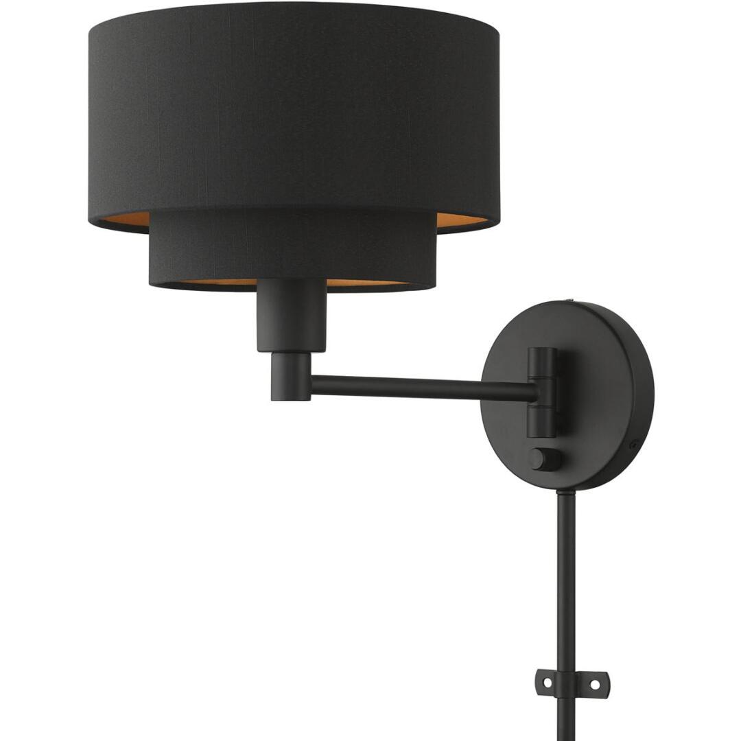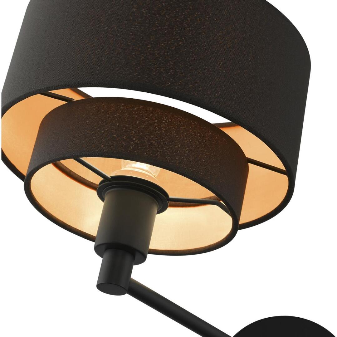 The one-light black finish Sentosa swing arm wall lamp has a modern and retro appeal. The hand-crafted black fabric hardback drum shades are set off by an inner silky orange fabric which creates a versatile effect. Perfect fit for the living room, dining room, kitchen or bedroom.