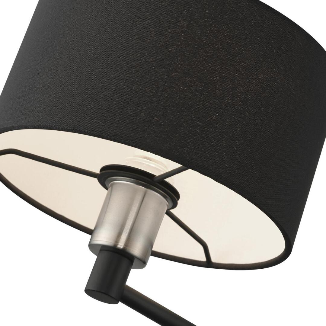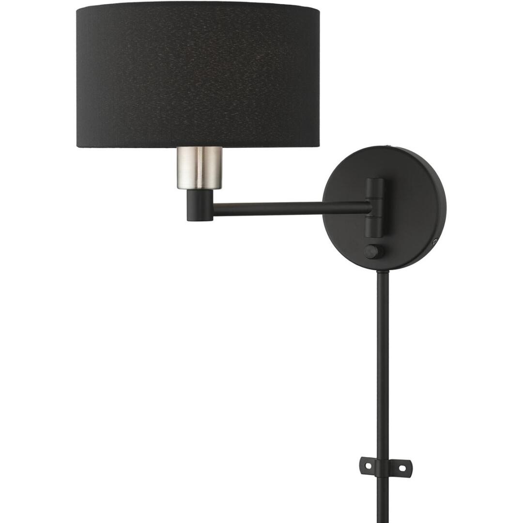 The one-light Bainbridge swing arm wall lamp is both modern and versatile. The hand-crafted black fabric hardback drum shade is set off by an inner white fabric which creates a versatile effect. Perfect fit for the living room, dining room, kitchen and bedroom.