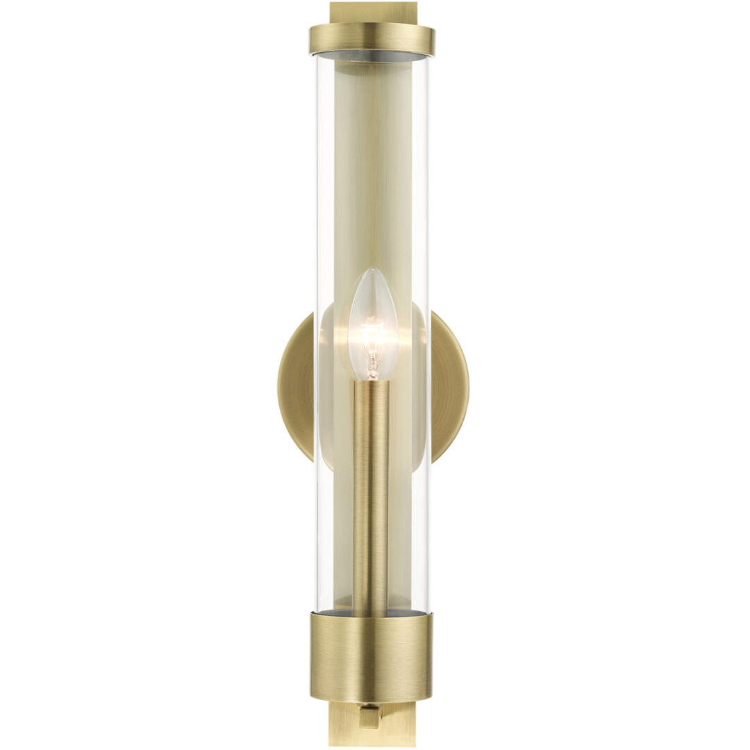 A glass cylinder shines with light as steel straps and a rounded back plate ground this Castleton sconce with a modern style. The clean, transitional, versatile sleek look will add romantic light while maintaining your minimalist interior. This beautiful sconce comes in an antique brass finish. With its easy installation and low upkeep requirements, this light will not disappoint.