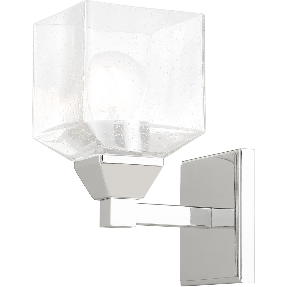 This wall sconce is sure to provide reliable illumination without sacrificing style. It features one clear seeded glass shade with an open bottom, exposing the bulb inside. A polished chrome finish covers the backplate and accents the light.