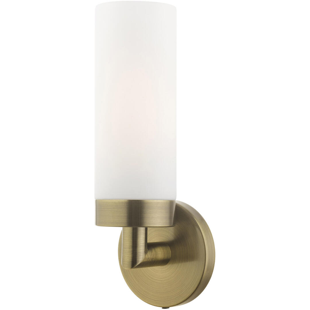 Add a dash of character and radiance to your home with this wall sconce. This single-light fixture from the Aero Collection features an antique brass finish with a satin opal white glass. The clean lines of the back plate complement the cylindrical glass shade creating a minimal, sleek, urban look that works well in most decors. This fixture adds upscale charm and contemporary aesthetics to your home.