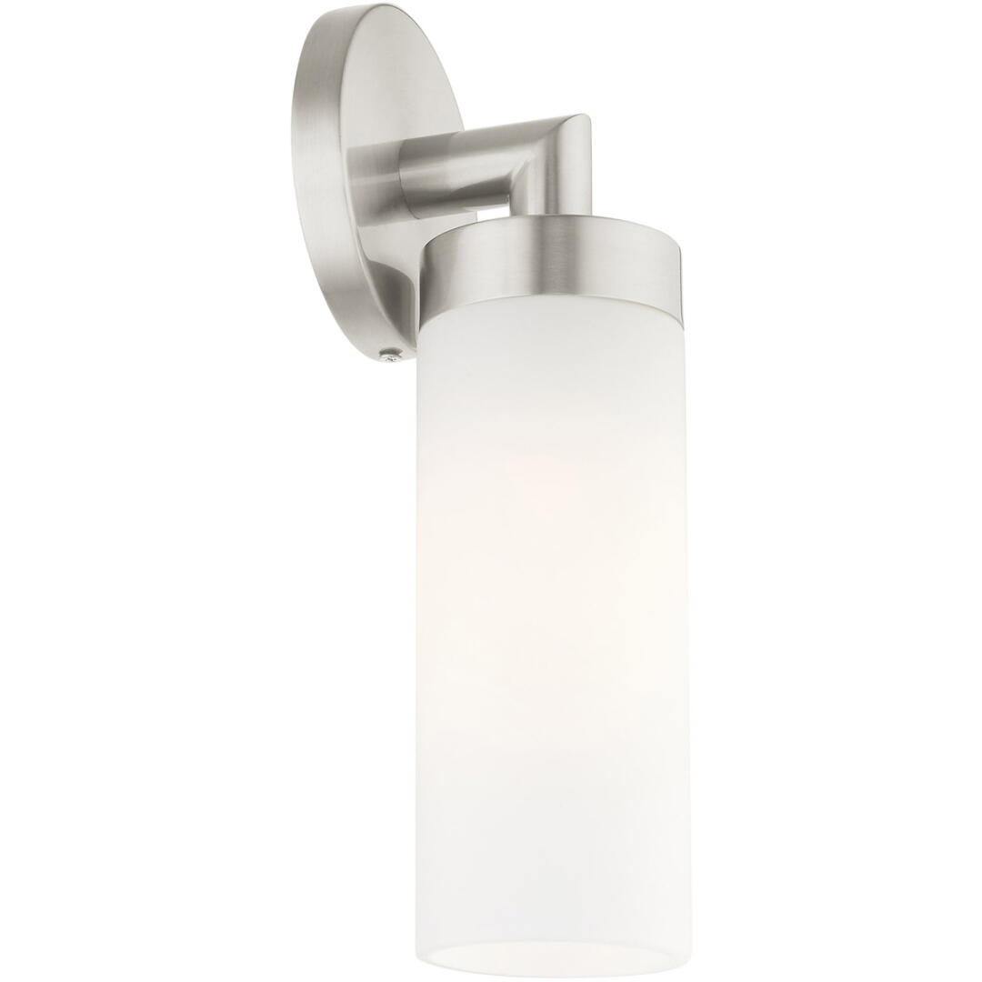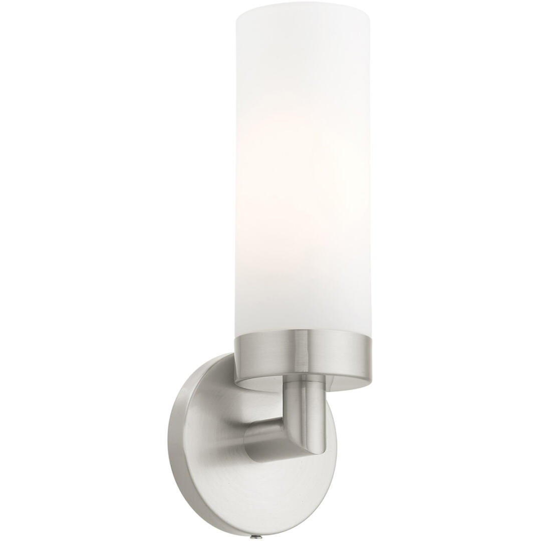 Add a dash of character and radiance to your home with this wall sconce. This single-light fixture from the Aero Collection features a brushed nickel finish with a satin opal white glass. The clean lines of the back plate complement the cylindrical glass shade creating a minimal, sleek, urban look that works well in most decors. This fixture adds upscale charm and contemporary aesthetics to your home.