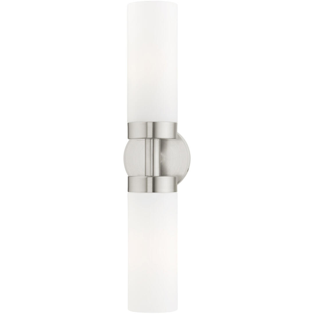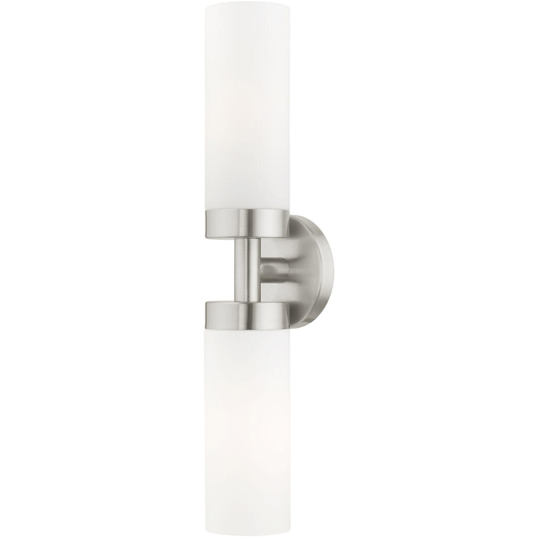 Add a dash of character and radiance to your home with this vanity sconce. This two-light fixture from the Aero Collection features a brushed nickel finish with two satin opal white glass cylinder shades on either side. The clean lines of the back plate complement the cylindrical glass shades creating a minimal, sleek, urban look that works well in most decors. This fixture adds upscale charm and contemporary aesthetics to your home.
