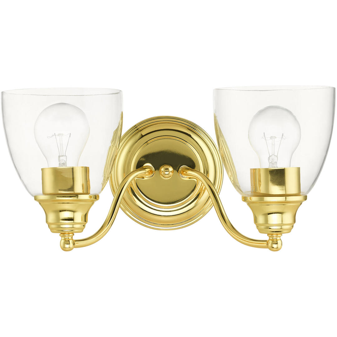 Whether it’s style or practical lighting, this vanity sconce is the perfect addition to your bathroom. This two-light fixture from the Montgomery Collection features clear hand-blown glass shades and is shown in a polished brass finish. The clean graceful lines of the back plate complement the shades, creating an understated look that works well in most decors. Classic elegance combines with contemporary appeal to enhance any home in style.
