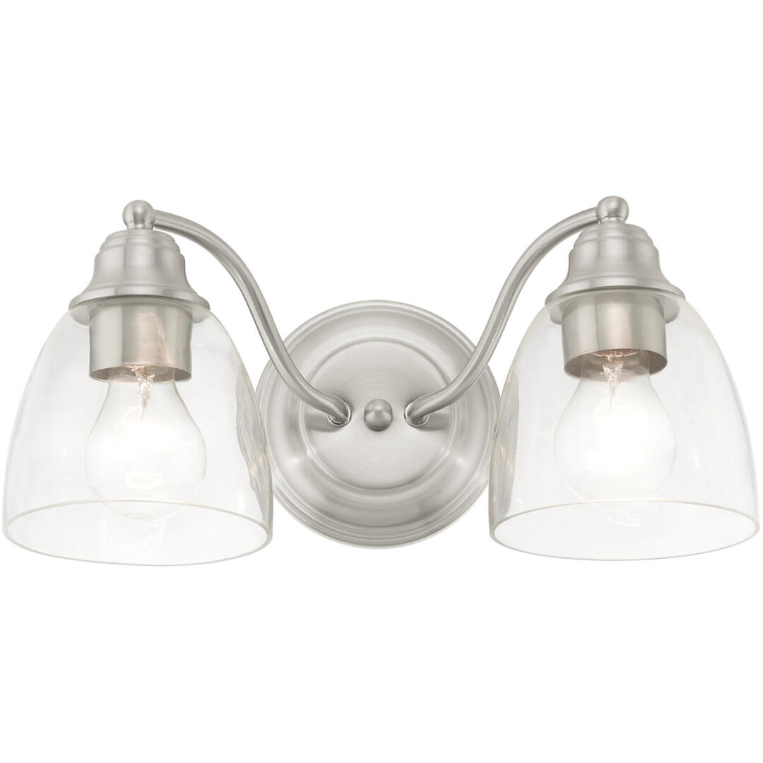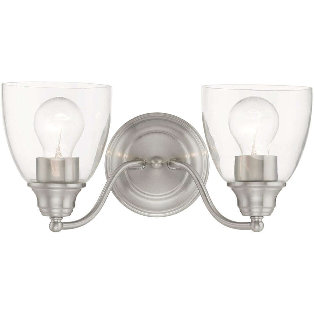 Whether it’s style or practical lighting, this vanity sconce is the perfect addition to your bathroom. This two-light fixture from the Montgomery Collection features clear hand-blown glass shades and is shown in a brushed nickel finish. The clean graceful lines of the back plate complement the shades, creating an understated look that works well in most decors. Classic elegance combines with contemporary appeal to enhance any home in style.