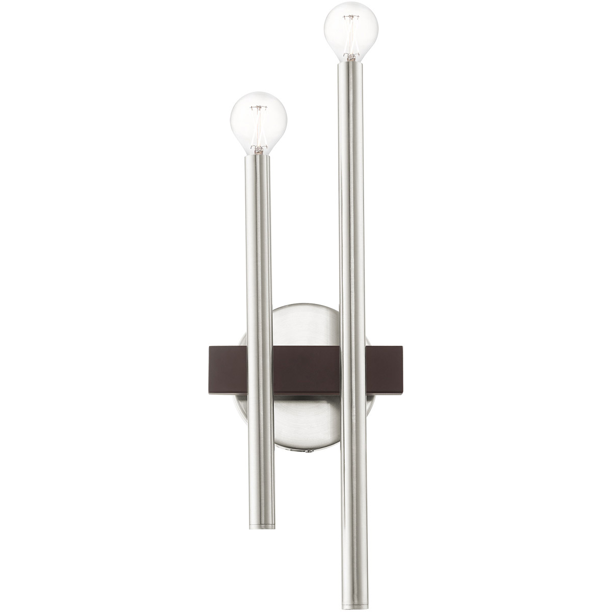 The clean lines of the Denmark collection remind of early modern Scandinavian style. The slim candles rise on the contrasting bar at different heights dynamically emulating the shape of a city skyline. This double-light exposed bulb sconce comes in a brushed nickel finish with bronze finish bars. Versatile enough for almost any interior where dramatic statement is needed such as a bathroom, hallway, dining room, living room or bedroom.