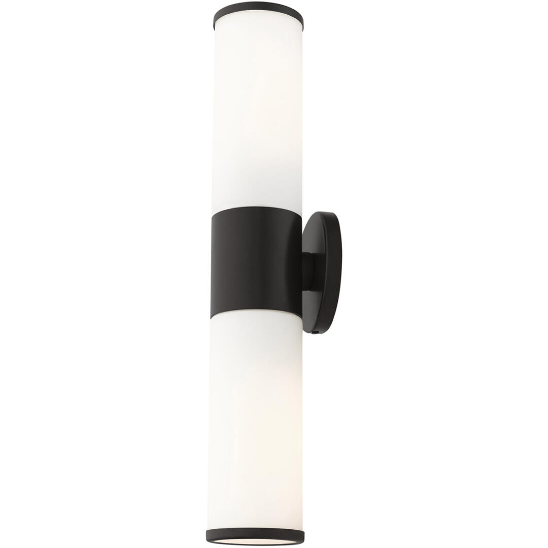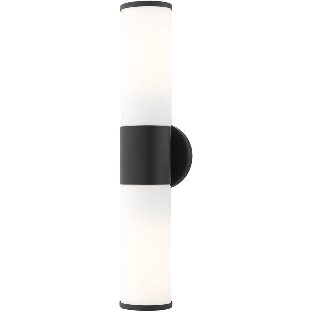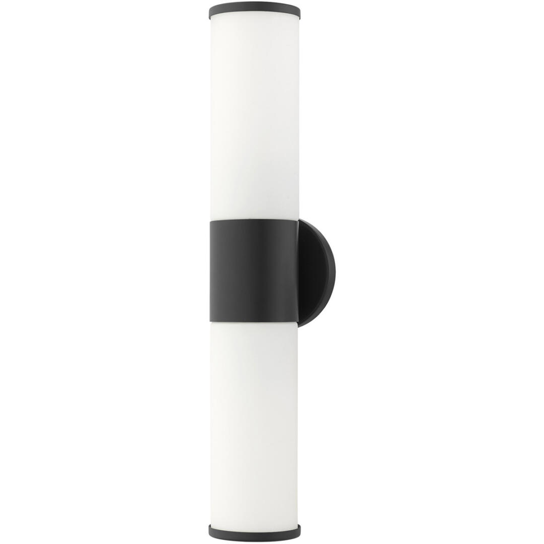 Add a dash of character and radiance to your home with this vanity sconce. This two-light fixture from the Lindale Collection features a black finish with two satin opal white glass cylinder shades on either side. The clean lines of the back plate complement the cylindrical glass shades adorned with detailed trim at the end of each glass creating a minimal, sleek, urban look that works well in most decors. This fixture adds upscale charm and contemporary aesthetics to your home.