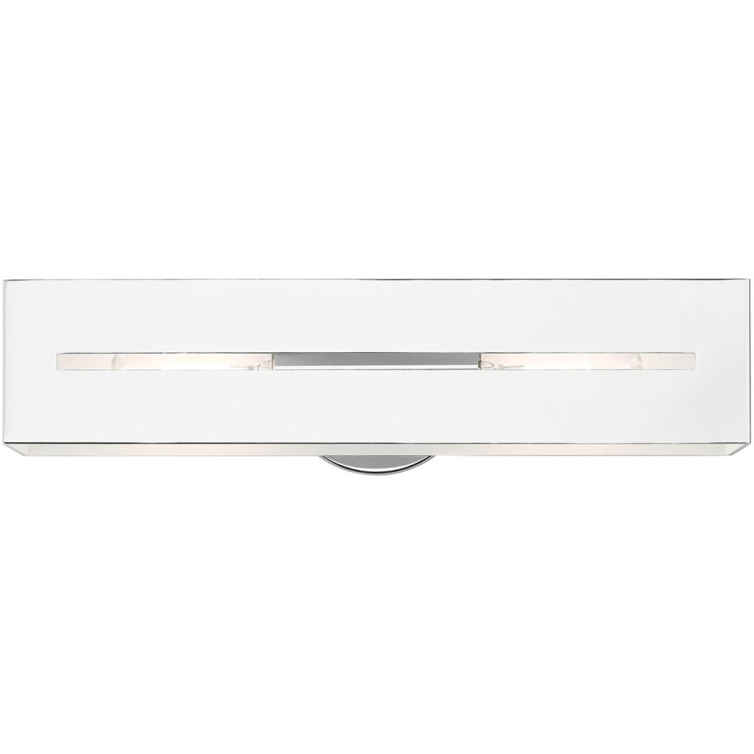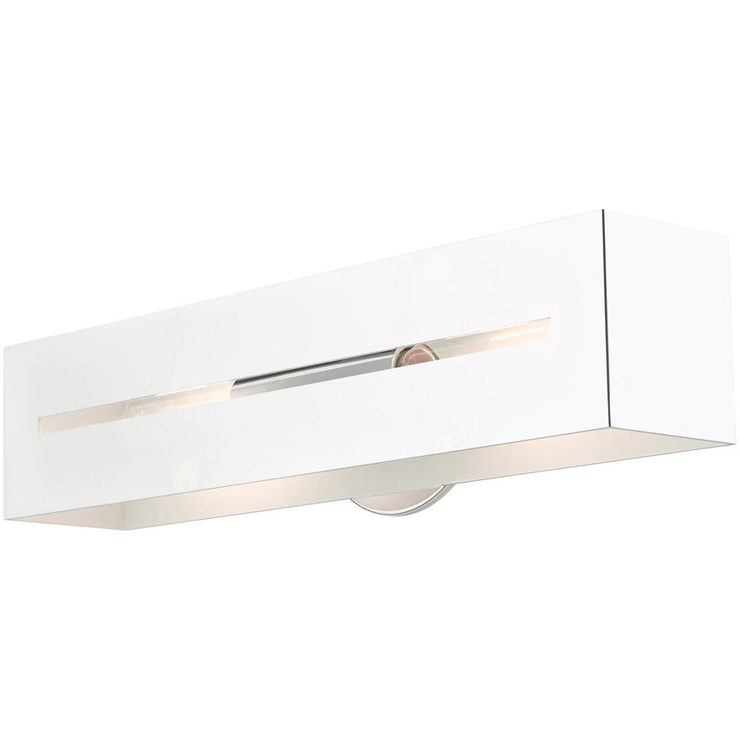 Inspired by the modern skyscraper design, the architectural lines of the Soma collection are truly suitable for urban and contemporary environments such as an industrial loft. The exposed bulbs make a beautiful accompaniment to the distinctive contrasting finishes of this rectilinear piece. This contemporary two light vanity sconce comes in a polished chrome finish with a shiny white finish inside. It fits perfectly in a minimalistic modern bathroom, hallway or living room.