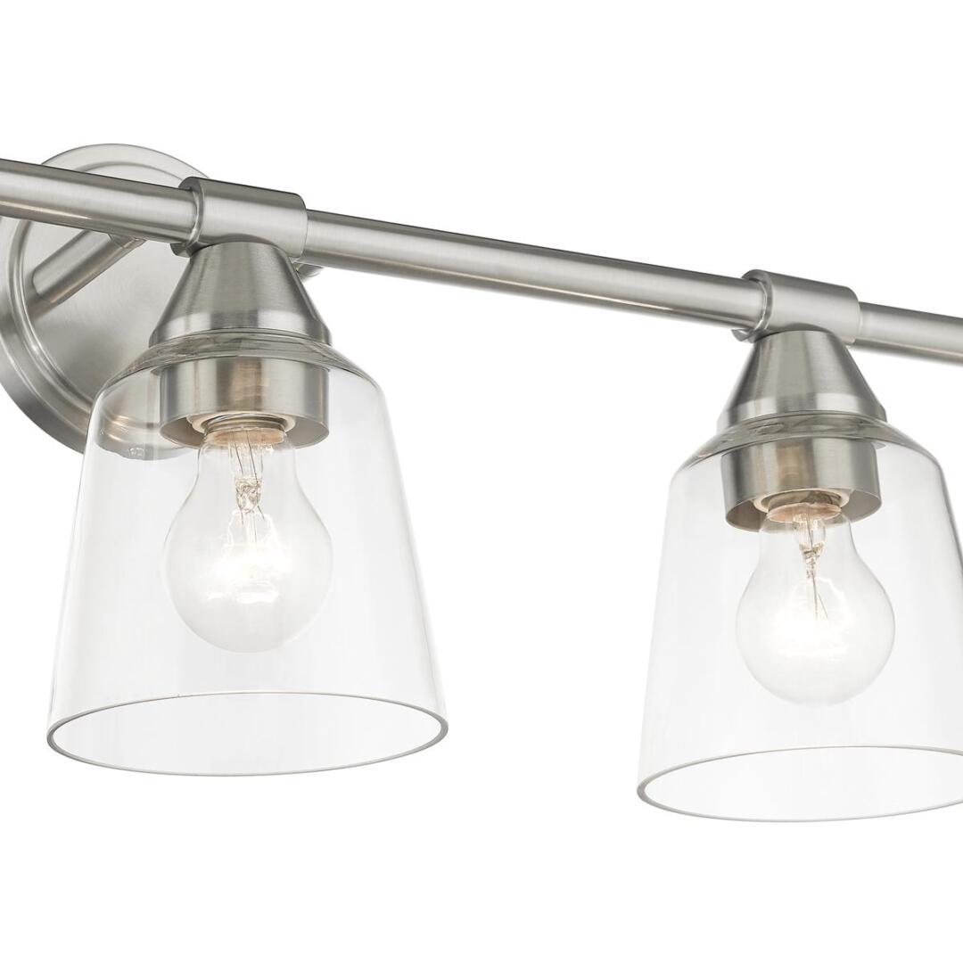 The clean and simple Catania vanity sconce features a brushed nickel finish with hand blown clear glass. This sleek design will brighten up any bathroom.
