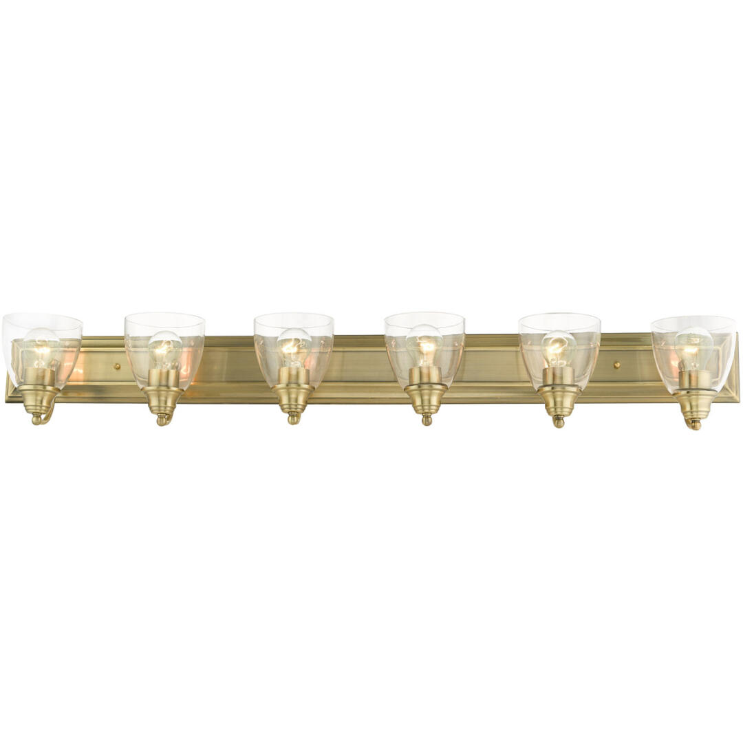 Bring a beautiful new look to your bathroom or vanity area with this charming extra-large six-light vanity sconce from the Birmingham collection. A wide rectangular antique brass finish back plate supports six simple graceful arms that hold six hand blown clear glass shades. The clean lines of this updated classic will make this piece an appealing part of your home.