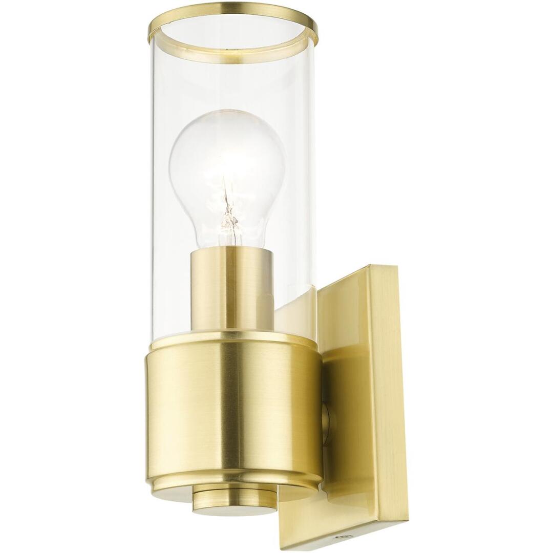 The stunning Quincy sconce features a satin brass finish with clear glass. This sleek design will brighten up any bathroom or wall application.
