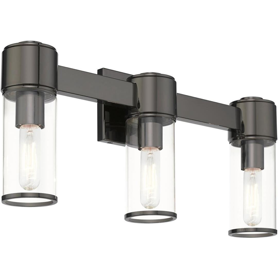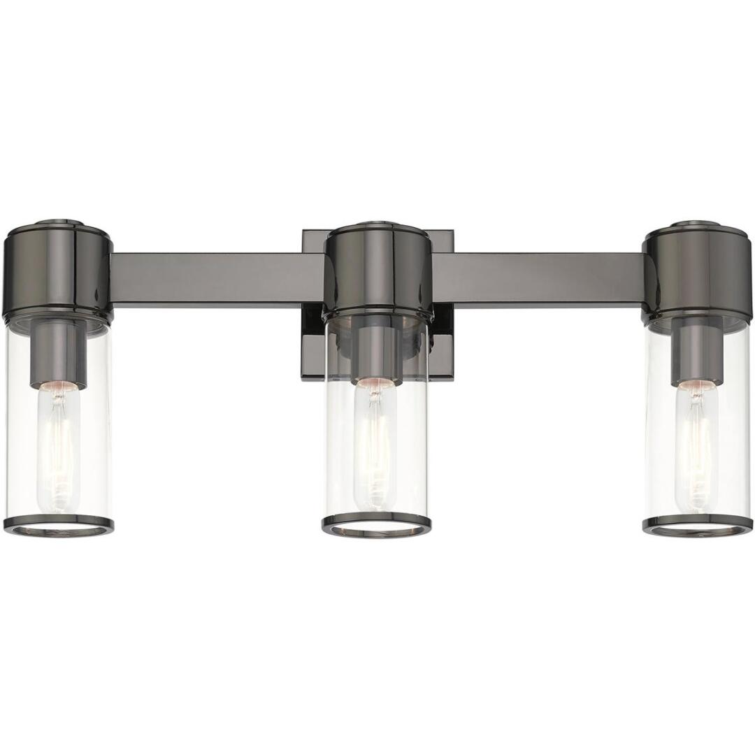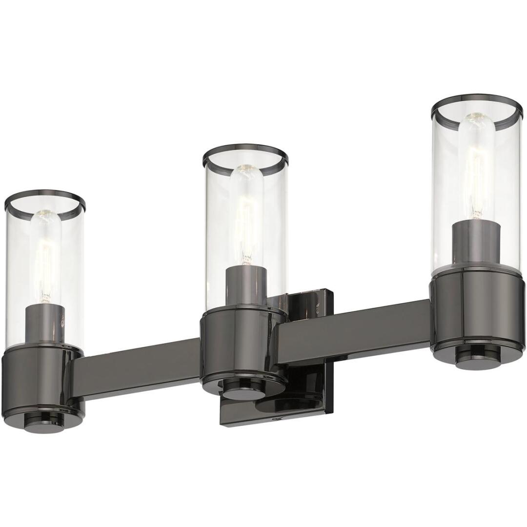 The stunning Quincy vanity sconce features a black chrome finish with clear glass. This sleek design will brighten up any bathroom.