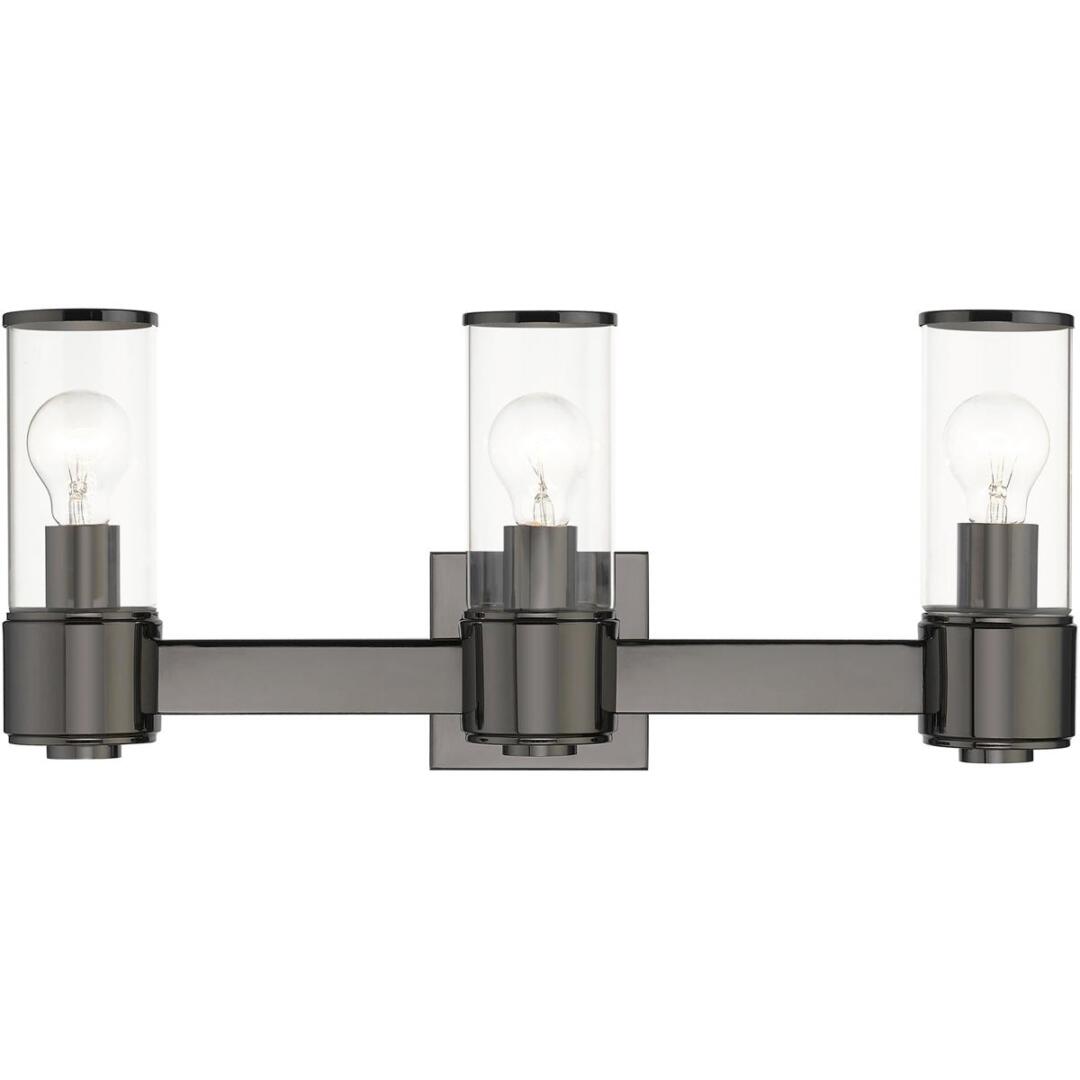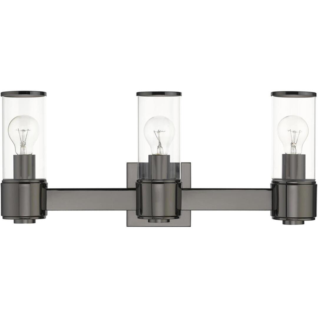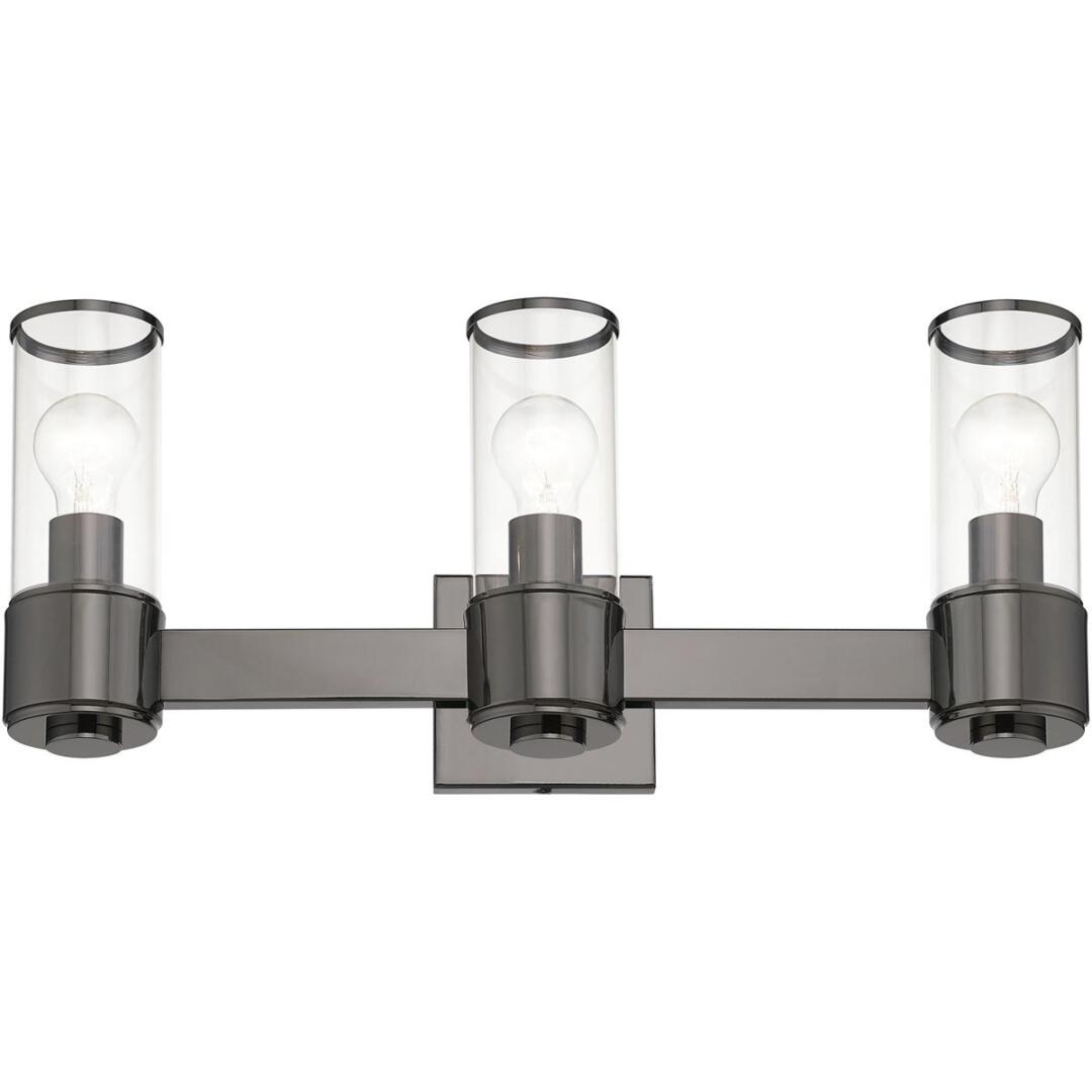 The stunning Quincy vanity sconce features a black chrome finish with clear glass. This sleek design will brighten up any bathroom.