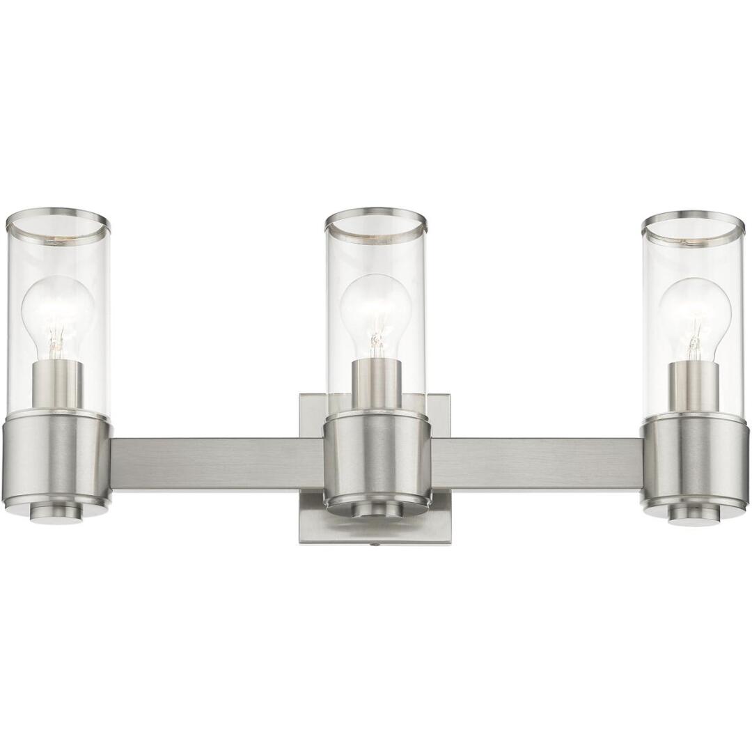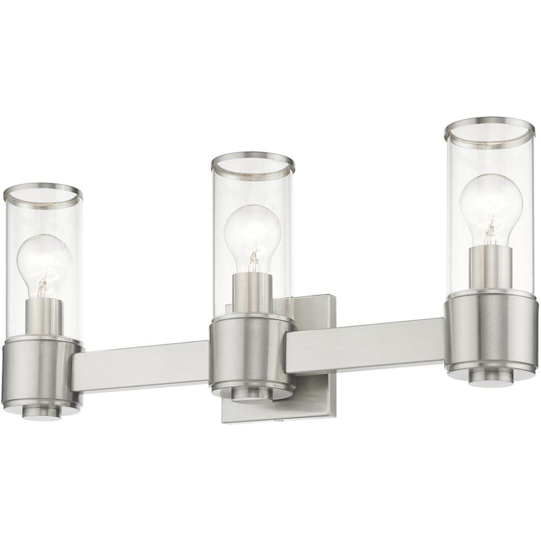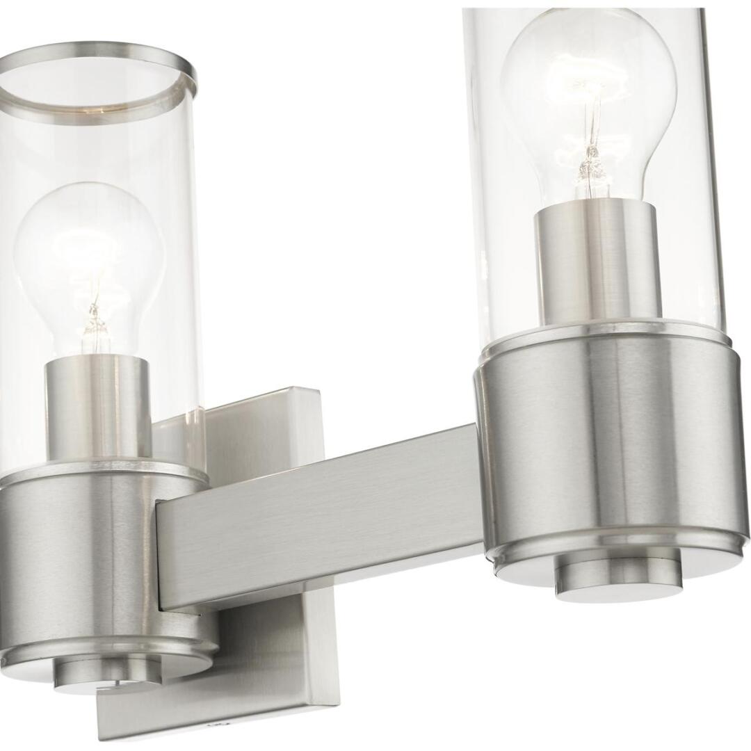 The stunning Quincy vanity sconce features a brushed nickel finish with clear glass. This sleek design will brighten up any bathroom.