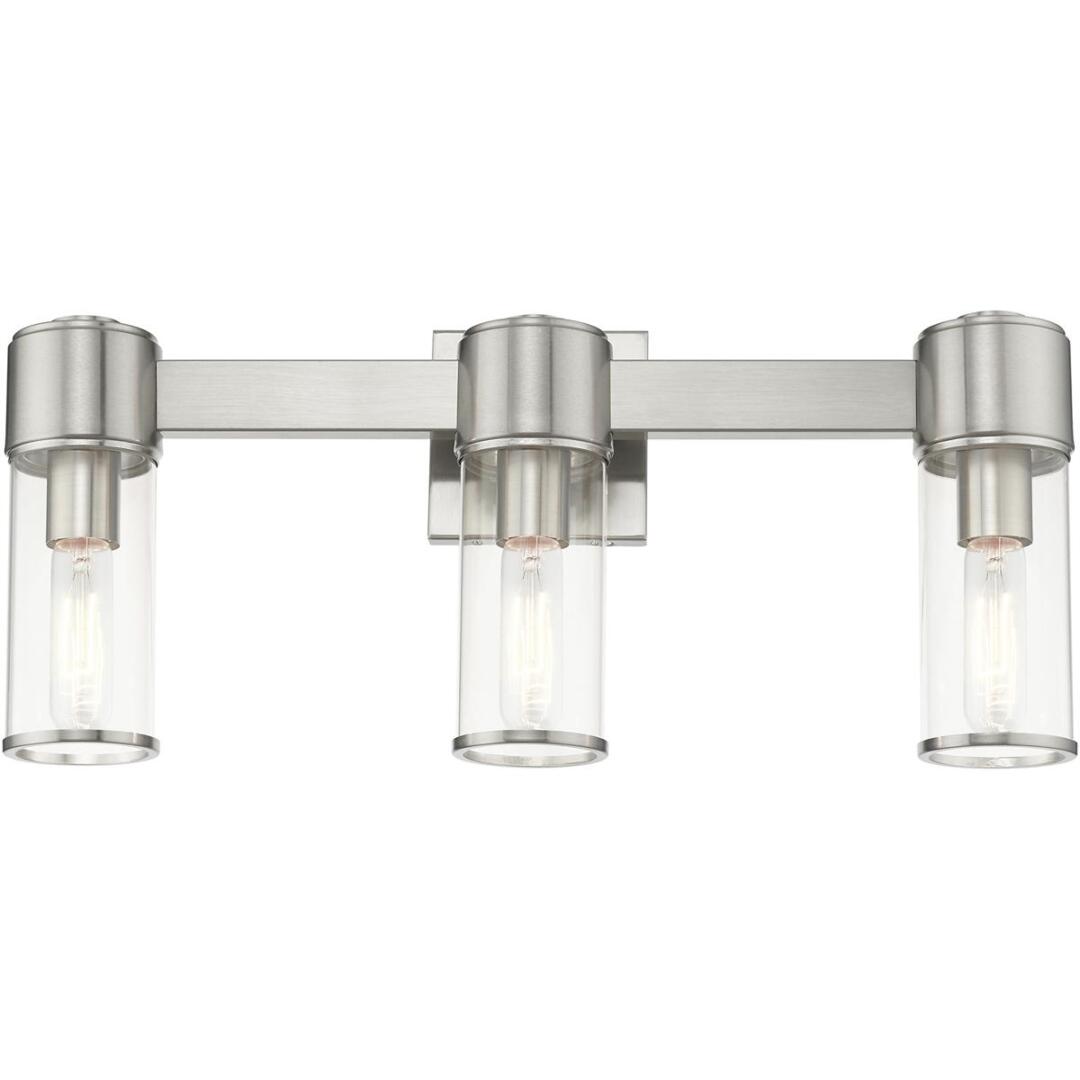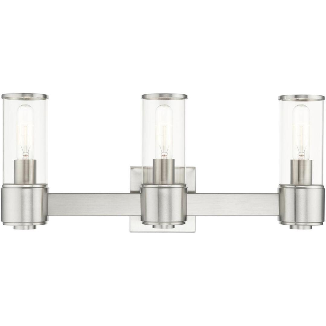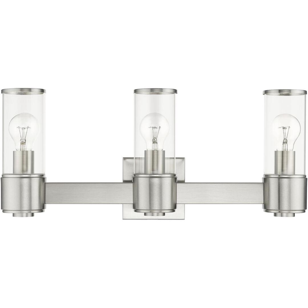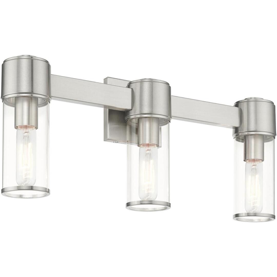 The stunning Quincy vanity sconce features a brushed nickel finish with clear glass. This sleek design will brighten up any bathroom.