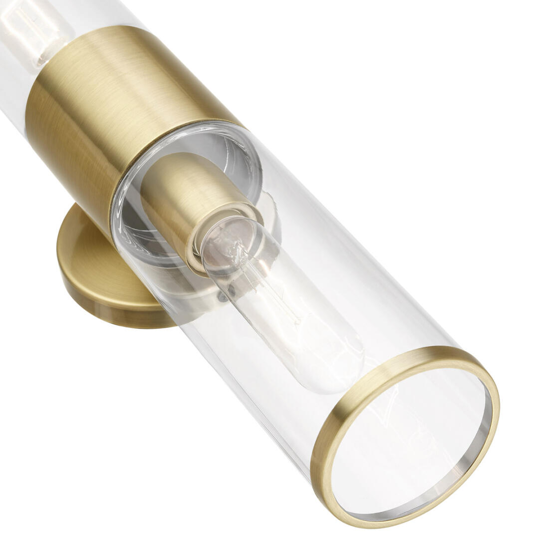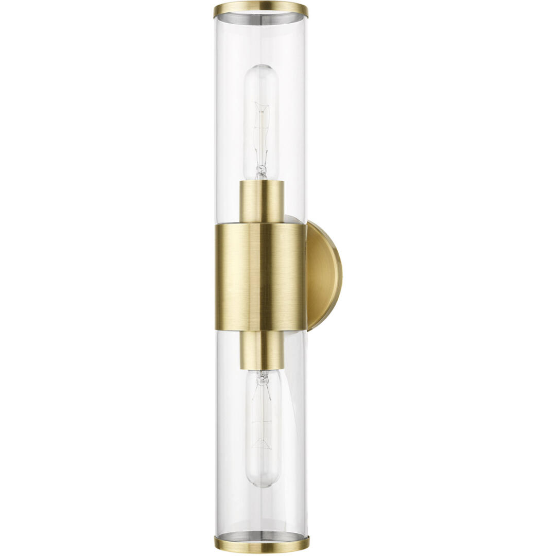 Add a dash of character and radiance to your home with this wall sconce. This double-light fixture from the Banca Collection features an antique brass finish with clear hand blown glass intentionally exposing the bulb inside for a trendy look. The clean lines of the back plate complement the cylindrical glass shade adorned with detailed trim on top creating an industrial, sleek, urban look that works well in most of today’s interiors. This fixture adds upscale charm and contemporary aesthetics to your home.