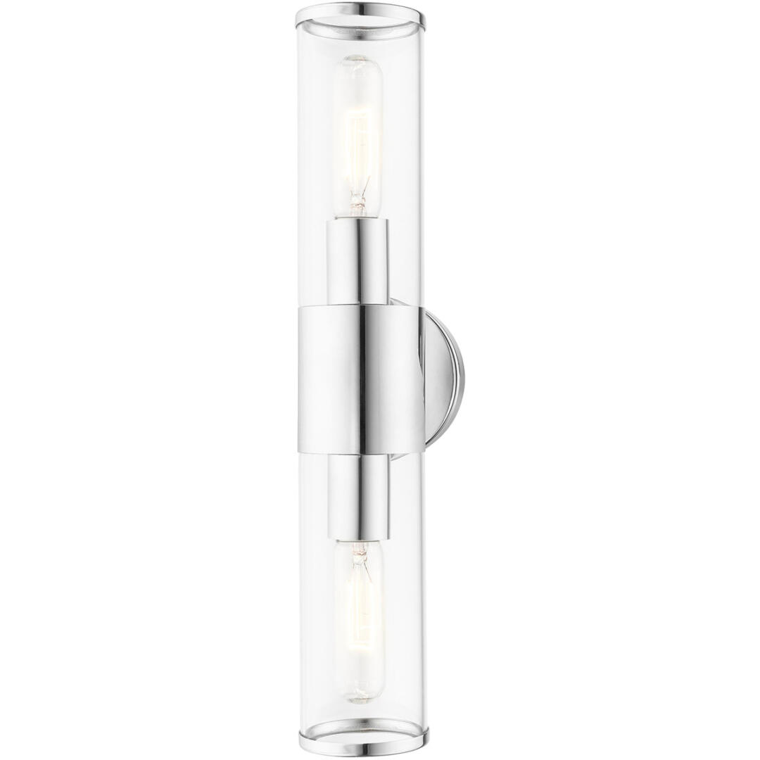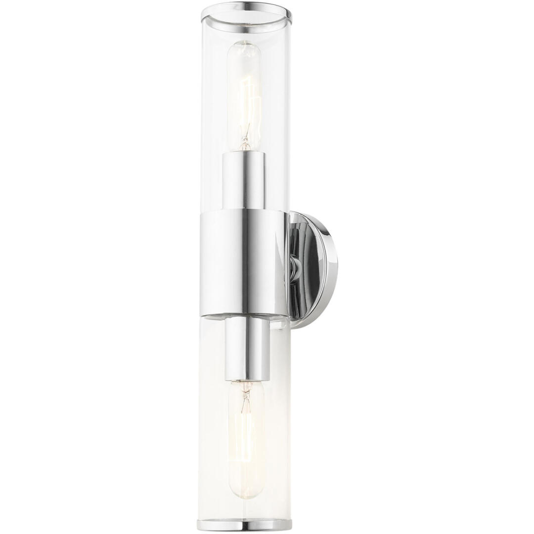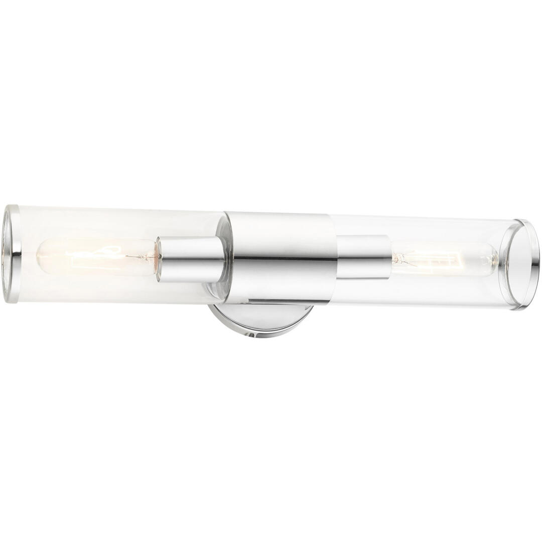 Add a dash of character and radiance to your home with this vanity sconce. This two-light fixture from the Banca Collection features a polished chrome finish with two clear hand blown glass cylinder shades on either side, intentionally exposing the bulb inside for a trendy look. The clean lines of the back plate complement the cylindrical glass shades adorned with detailed trim at the end of each glass creating an industrial, sleek, urban look that works well in most of today’s interiors. This fixture adds upscale charm and contemporary aesthetics to your home.