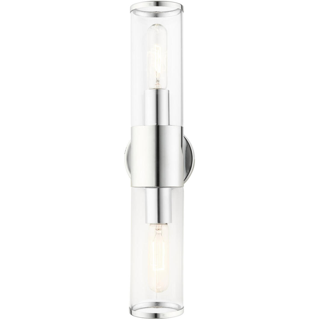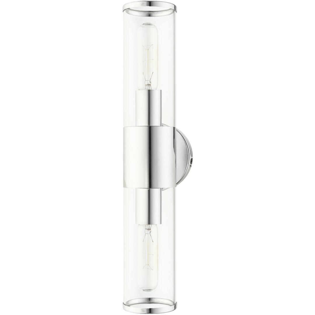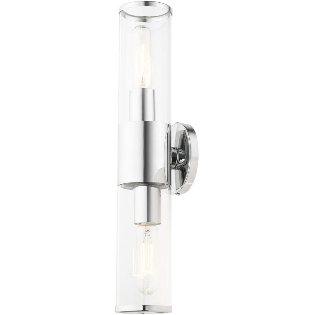 Add a dash of character and radiance to your home with this vanity sconce. This two-light fixture from the Banca Collection features a polished chrome finish with two clear hand blown glass cylinder shades on either side, intentionally exposing the bulb inside for a trendy look. The clean lines of the back plate complement the cylindrical glass shades adorned with detailed trim at the end of each glass creating an industrial, sleek, urban look that works well in most of today’s interiors. This fixture adds upscale charm and contemporary aesthetics to your home.