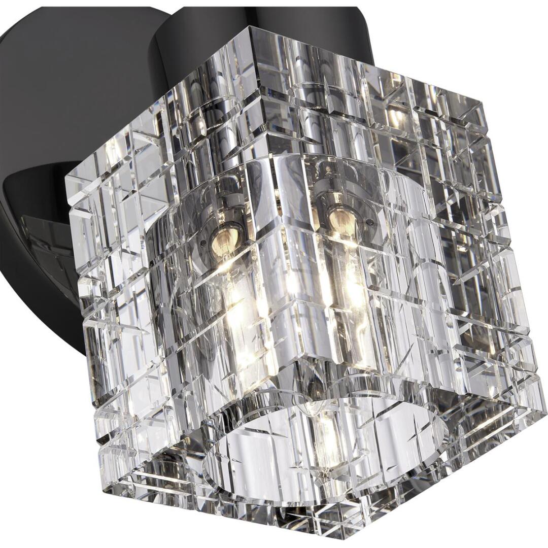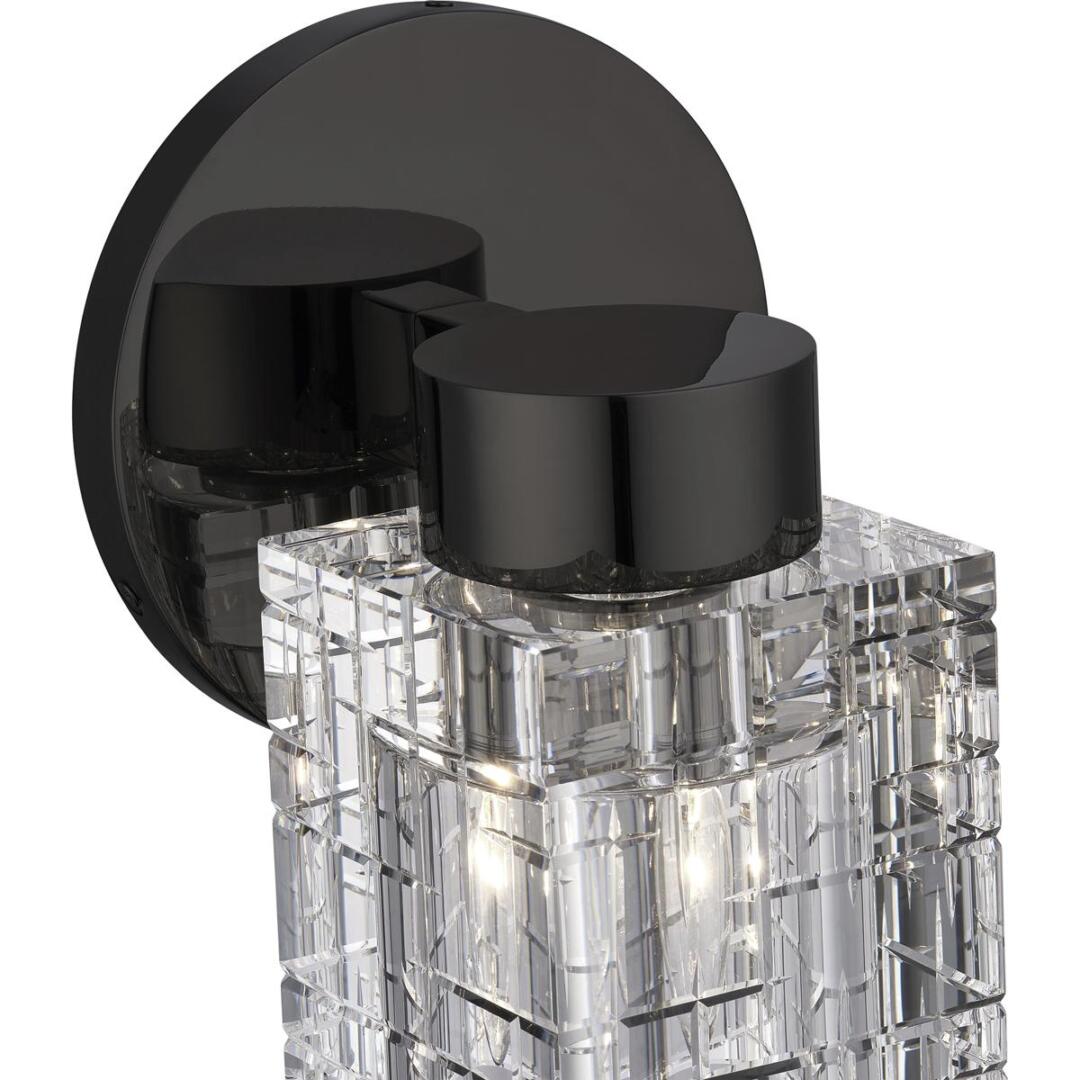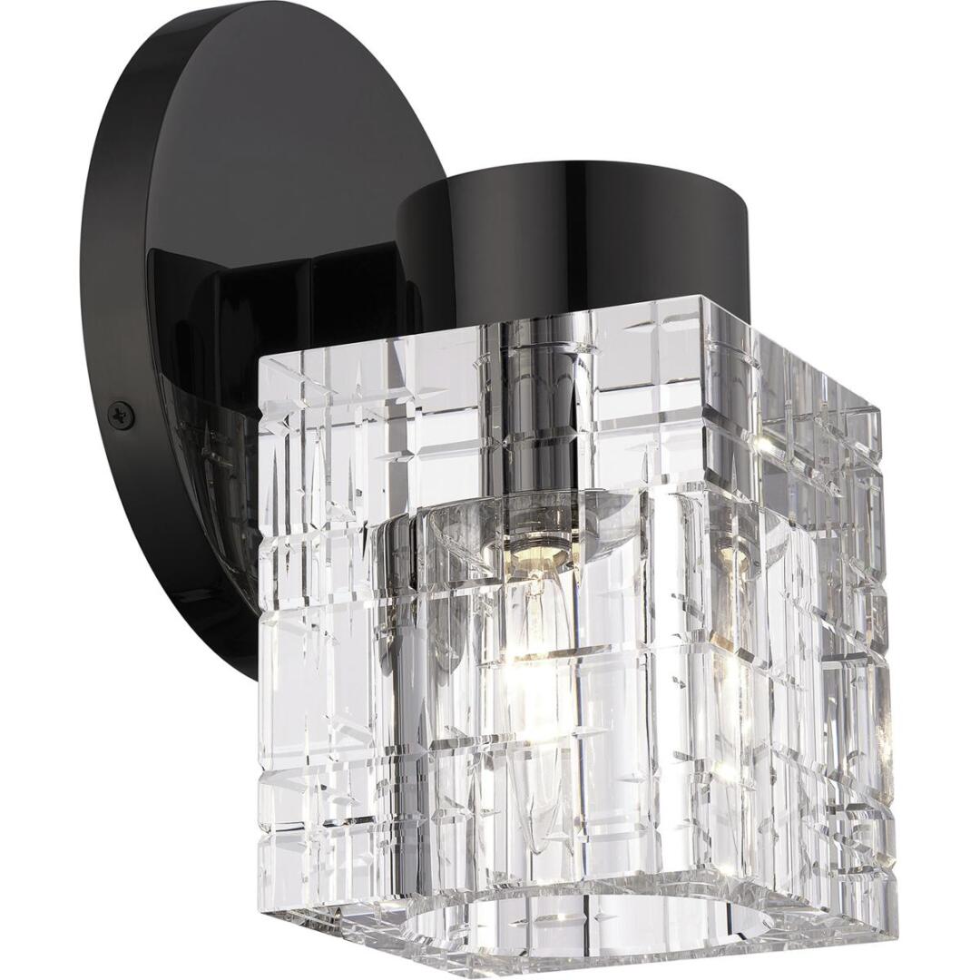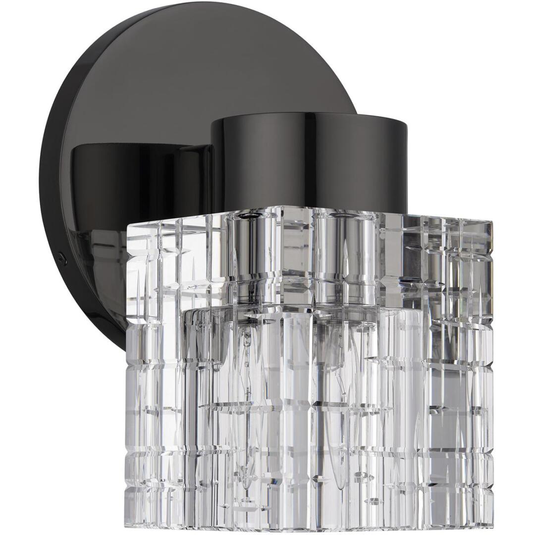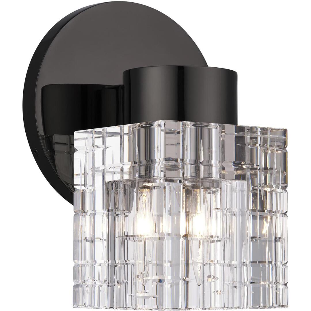 Clear faceted crystal makes an elegant appearance in this black chrome single sconce. The Rotterdam sconce is small and attractive, and will make just as dazzling an impression when used in multiples as it will when used alone.