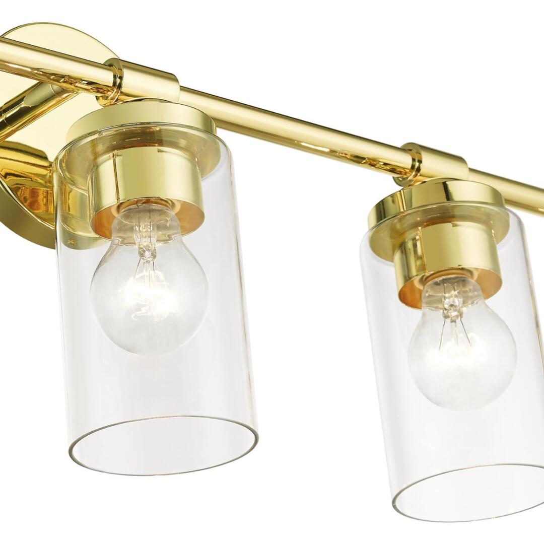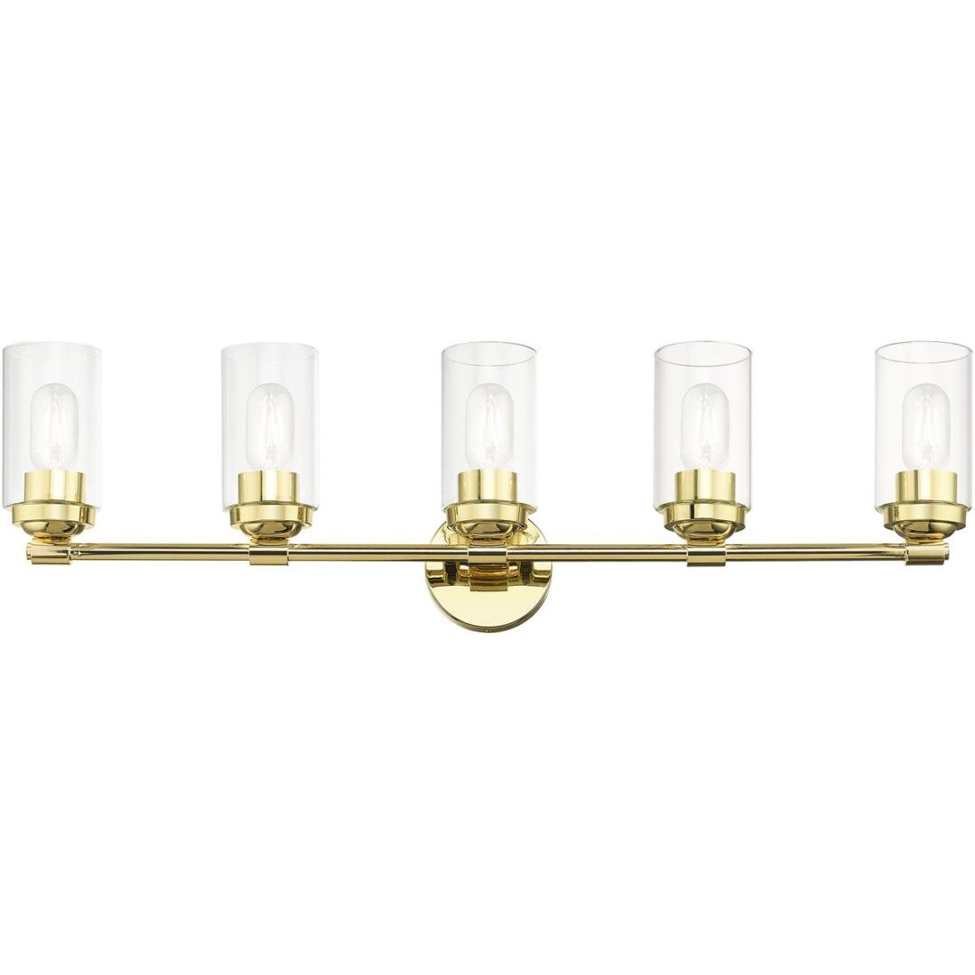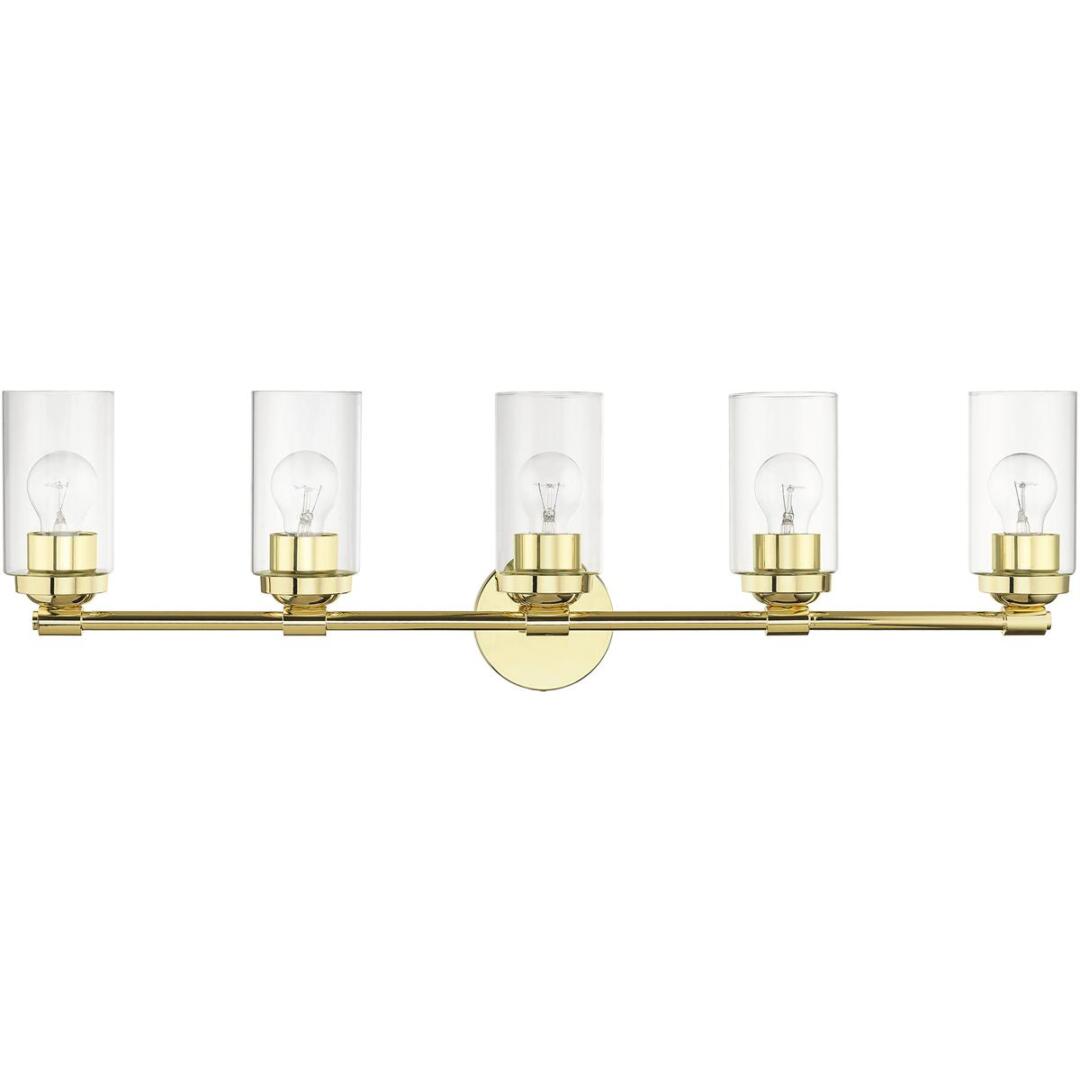 Illuminate your home with a bright design from the Whittier collection. This large five-light vanity sconce features a polished brass finish with clear glass. Perfect for a contemporary or transitional luxury bathroom setting.