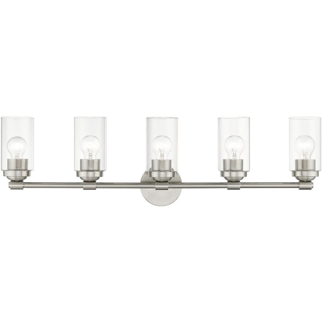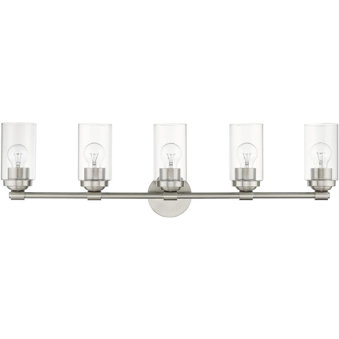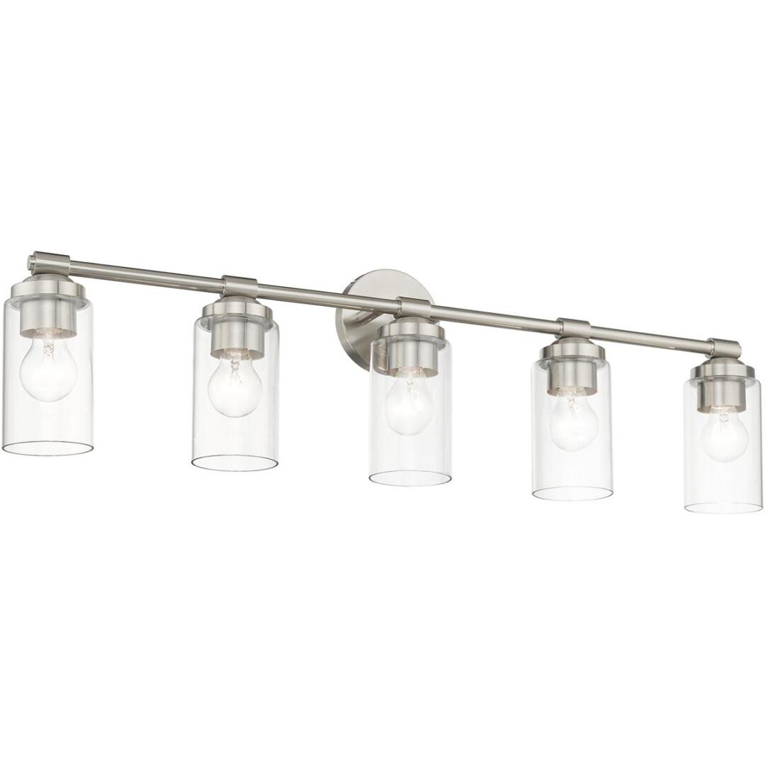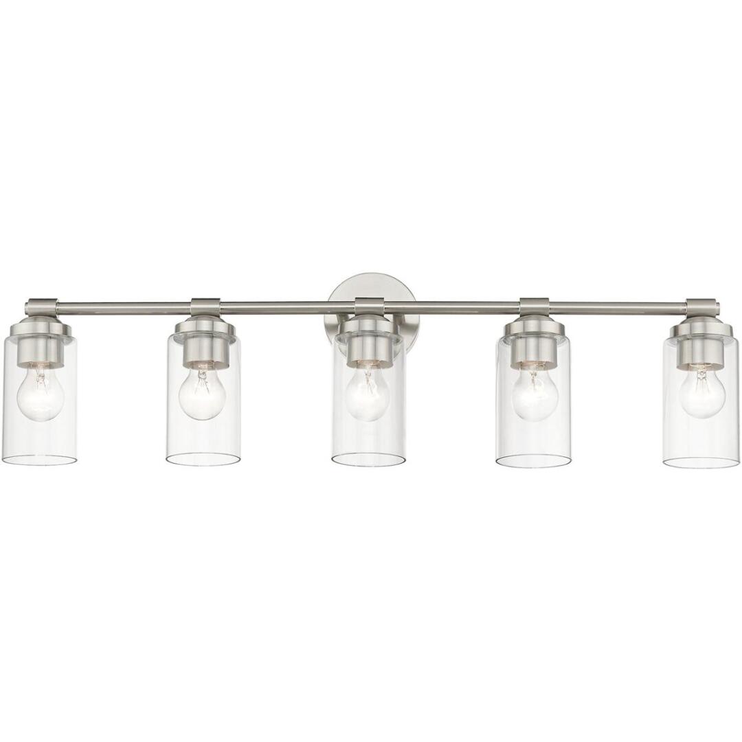 Illuminate your home with a bright design from the Whittier collection. This large five-light vanity sconce features a brushed nickel finish with clear glass. Perfect for a contemporary or transitional luxury bathroom setting.