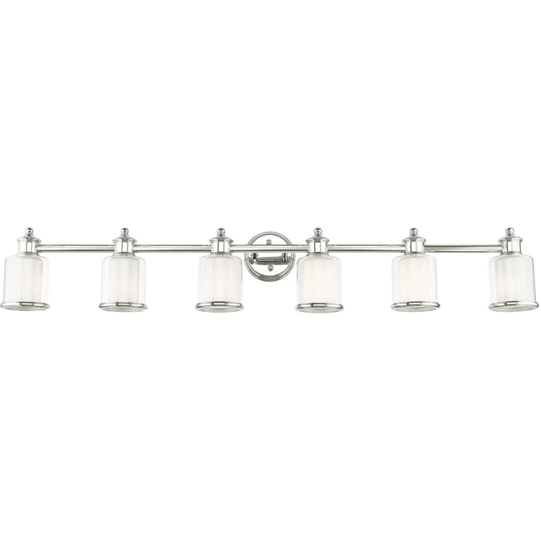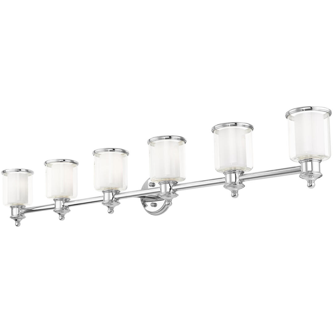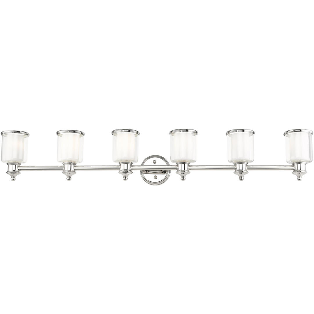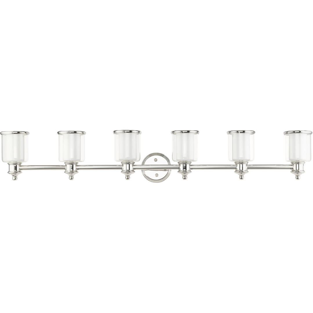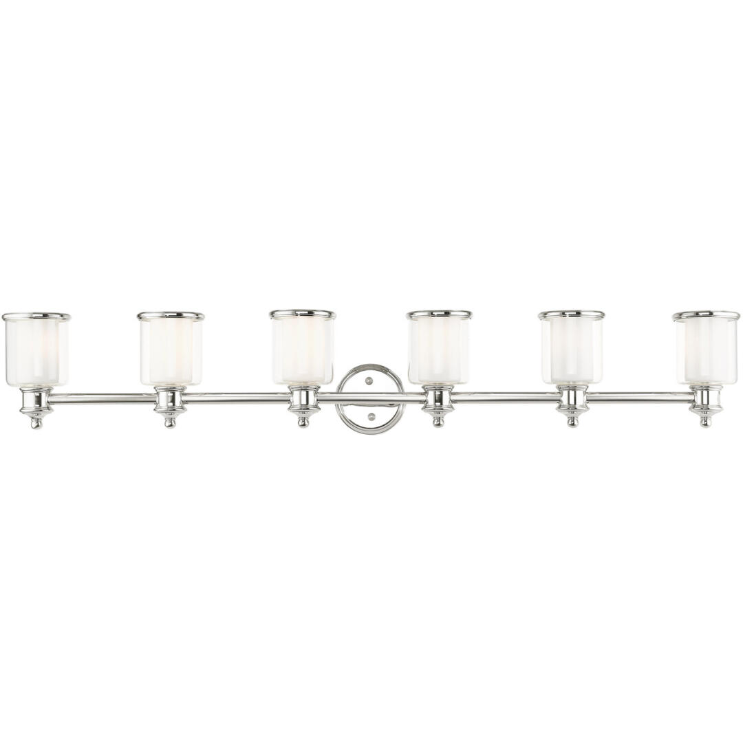 A magnificent home lighting choice, the Middlebush six-light vanity sconce effortlessly blends traditional style with clean, modern-day materials. A polished nickel finish adorns the simple rounded stem, topped with avant-garde double shaded hand-crafted glass. With its easy installation and low upkeep requirements, this light will not disappoint.