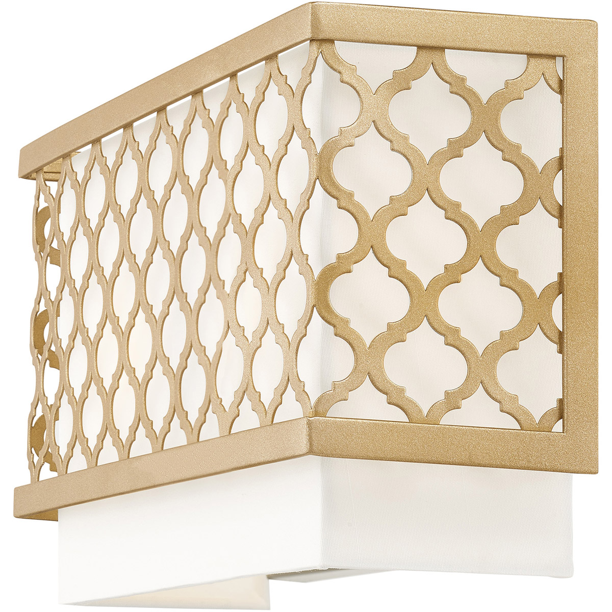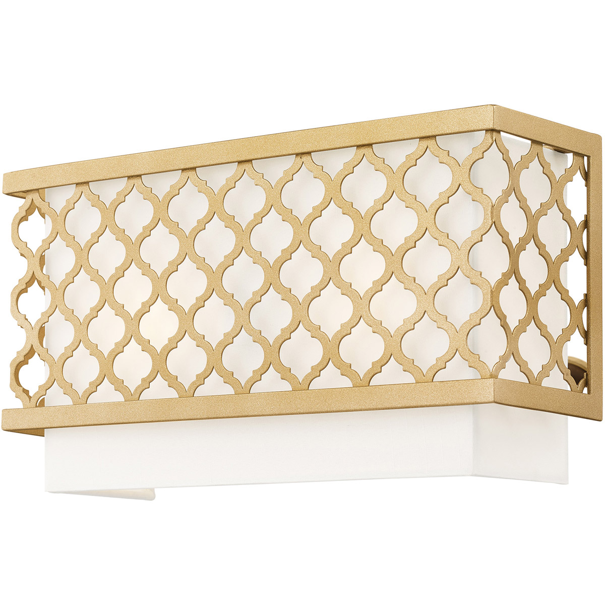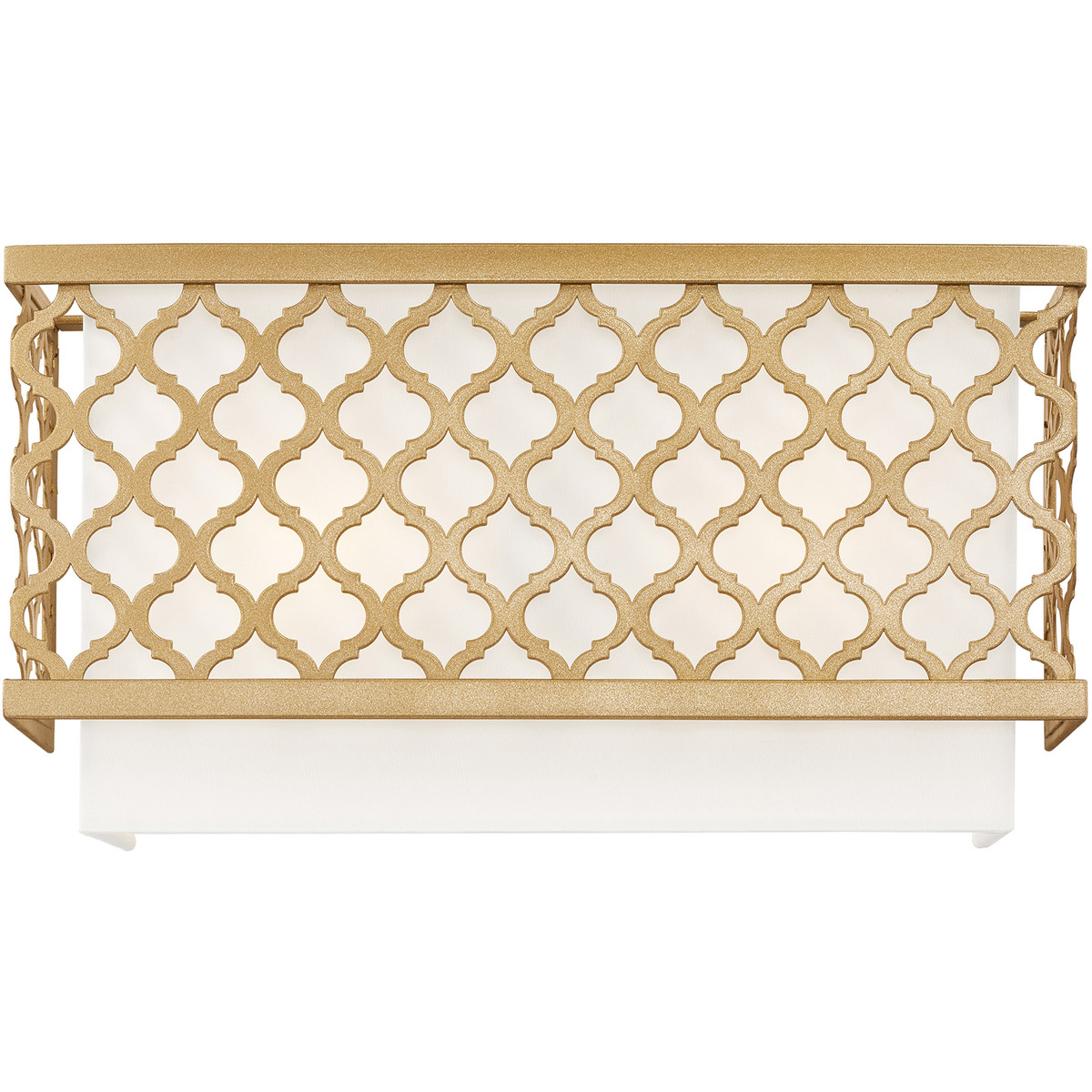 Our Arabesque two light wall sconce will add refined style and a hint of mystery to your decor. The off-white fabric hardback shade creates a warm illumination, while the light brings to life the intricate soft gold cutout pattern.