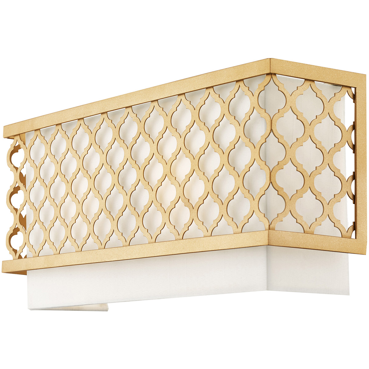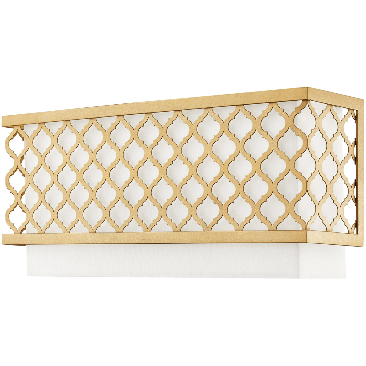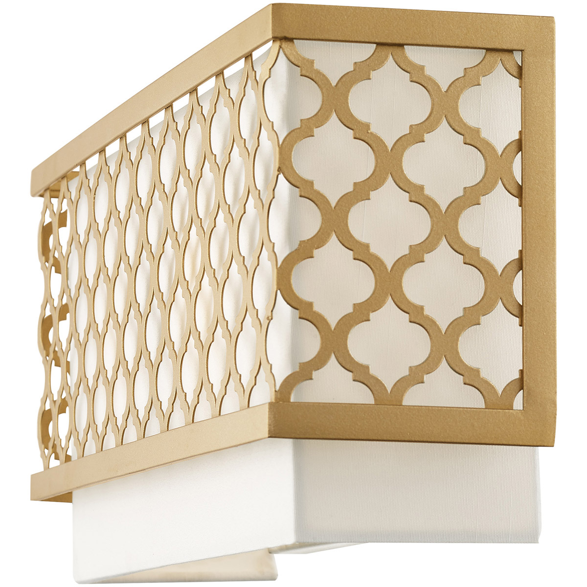 Our Arabesque two light wall sconce will add refined style and a hint of mystery to your decor. The off-white fabric hardback shade creates a warm illumination, while the light brings to life the intricate soft gold cutout pattern.