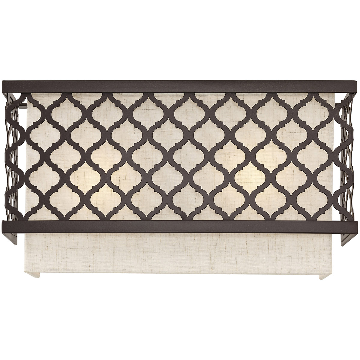 Our Arabesque two light wall sconce will add refined style and a hint of mystery to your decor. The oatmeal fabric hardback shade creates a warm illumination, while the light brings to life the intricate English bronze cutout pattern.