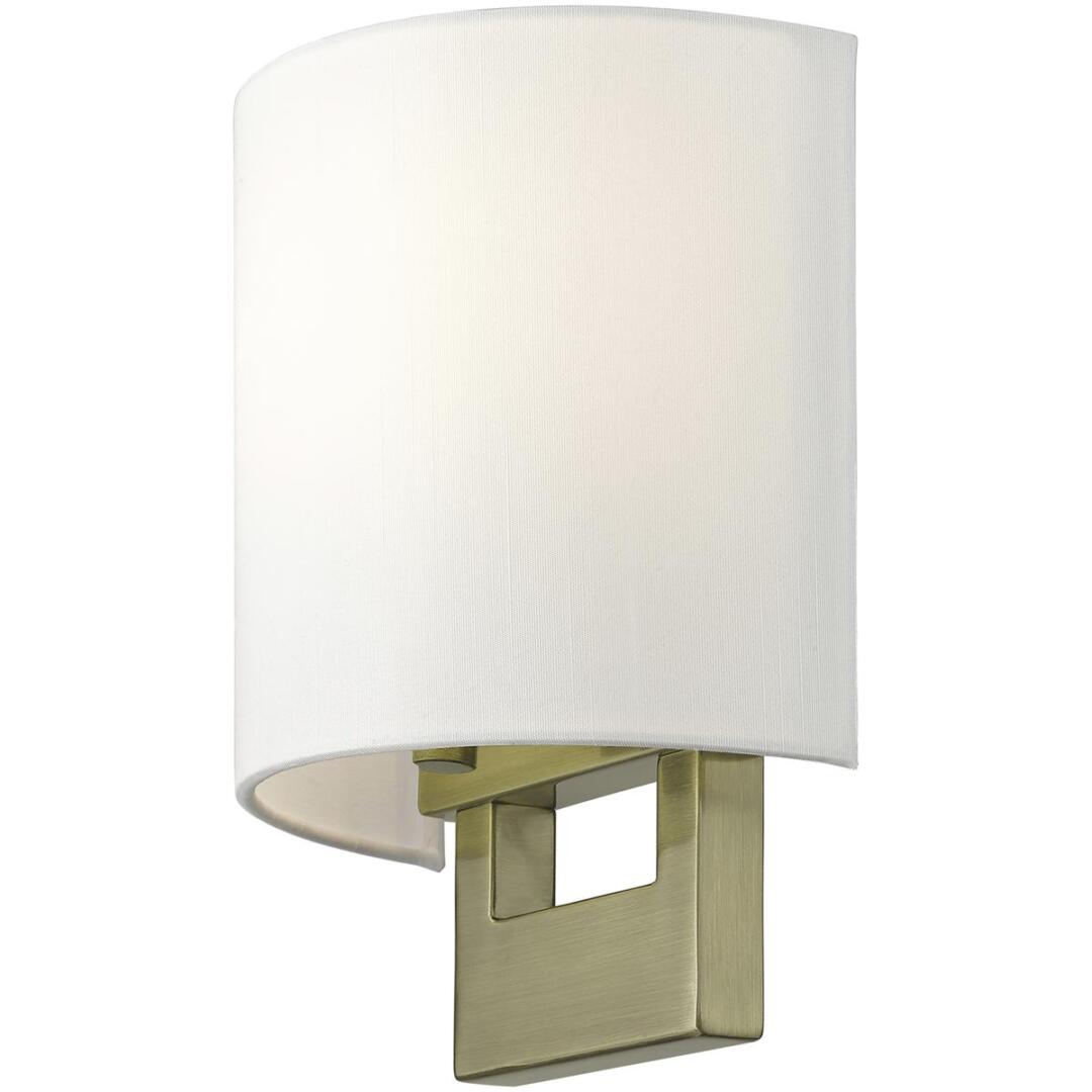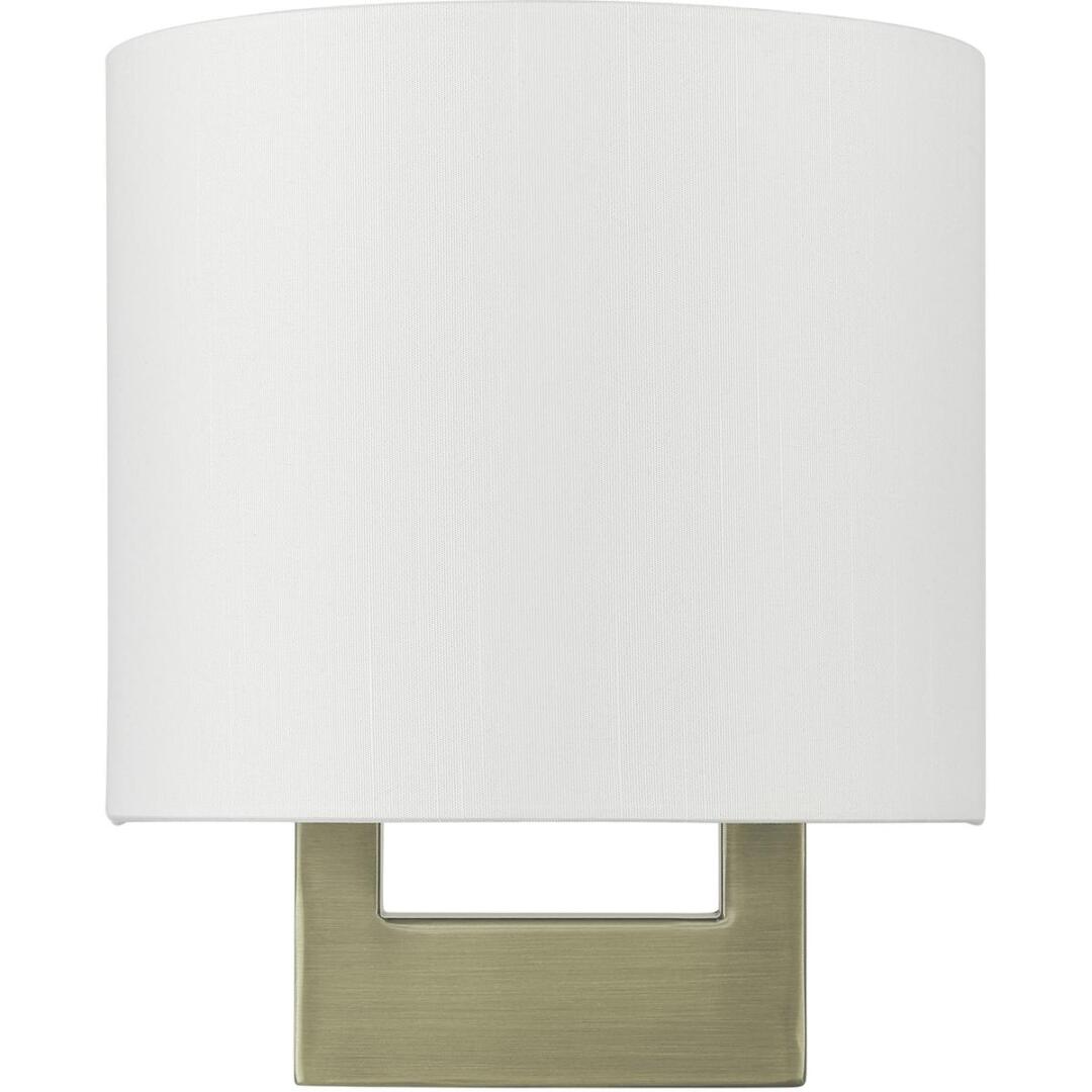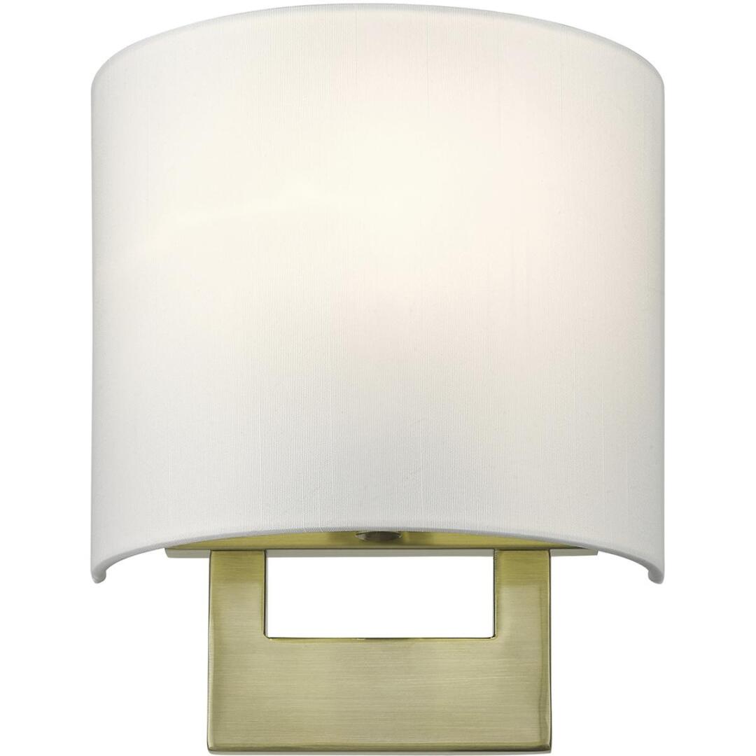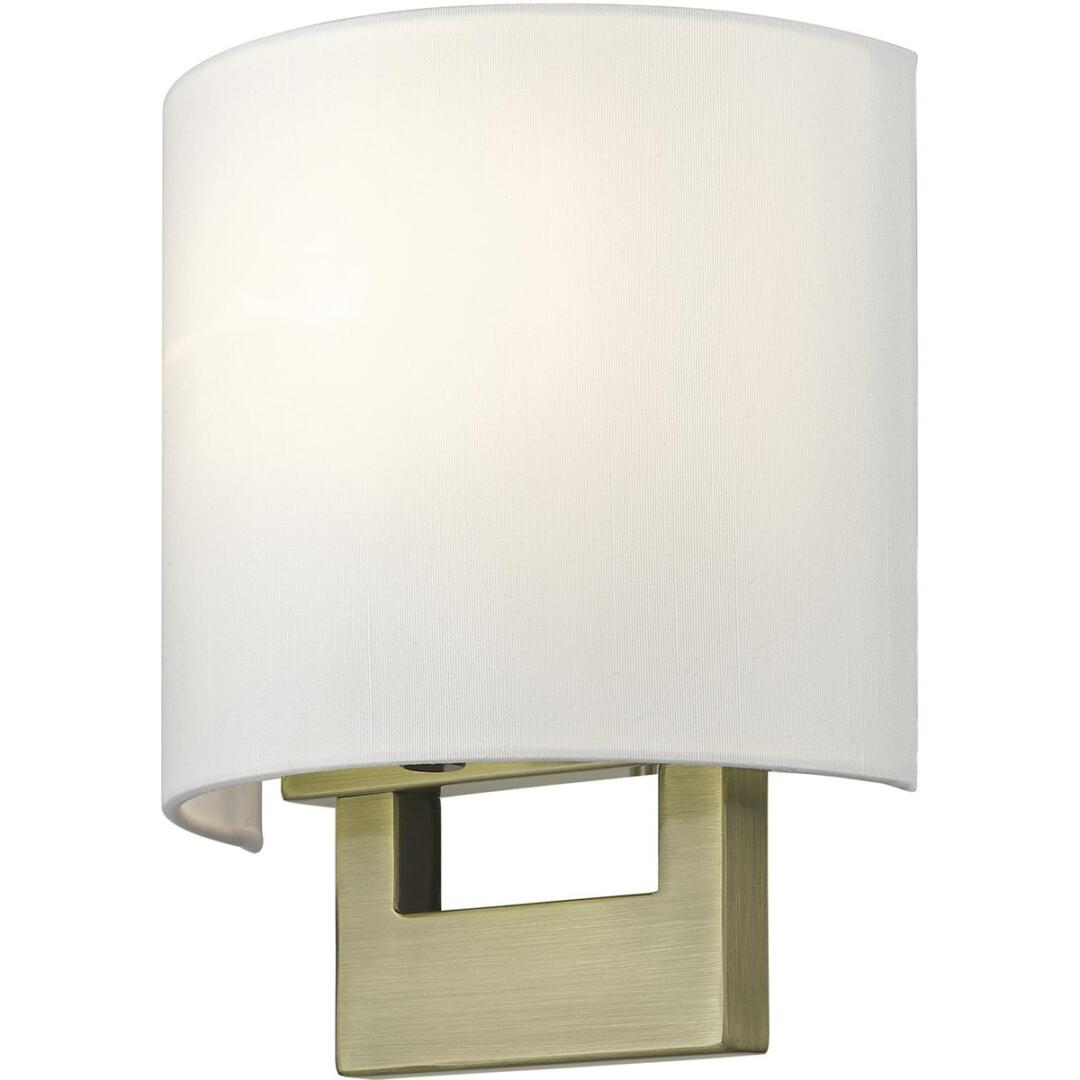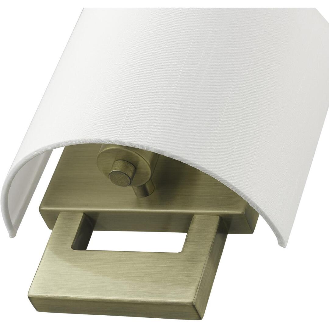 Raise the style bar with a designer wall sconce in a handsome and versatile contemporary manner. This one light wall sconce comes in an antique brass finish with a rectangular off-white fabric hardback shade.
